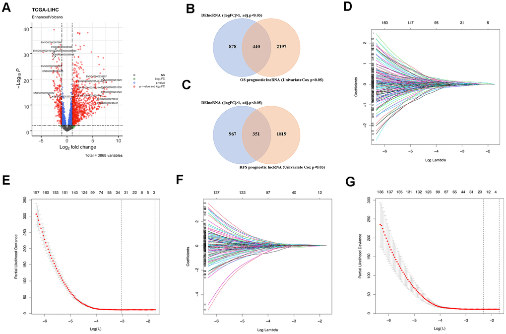 The comprehensive RNA expression profile containing tumor tissue (n = 369) and adjacent control (n = 50) was accessed from the TCGA database as previously described. Of the 14089 lncRNAs extracted from the RNA-seq data, 1318 lncRNAs were identified as DElncRNA under the condition of |logFC| > 1 and adj.p < 0.05 (Figure 2A and Supplementary Figure 1). Besides, 2637 and 2170 lncRNAs related to OS and RFS duration time were screened out by univariate COX regression analysis (p < 0.05). Subsequently, prognostic gene candidates for OS (n = 440) and RFS (n = 351) were determined by overlapping DElncRNAs and univariate COX positive lncRNAs (Figure 2B, 2C). The training cohort and the validation cohort for both OS and RFS classifiers do not have a significant difference. The LASSO regression and multivariate COX analysis were then performed in OS and RFS training group, respectively, at a 20-fold cross-validation manner to generate the lncRNA-based classifiers for OS (Figure 2D, 2E and Supplementary Figure 2A), and RFS (Figure 2F, 2G and Supplementary Figure 2B) prognostics.