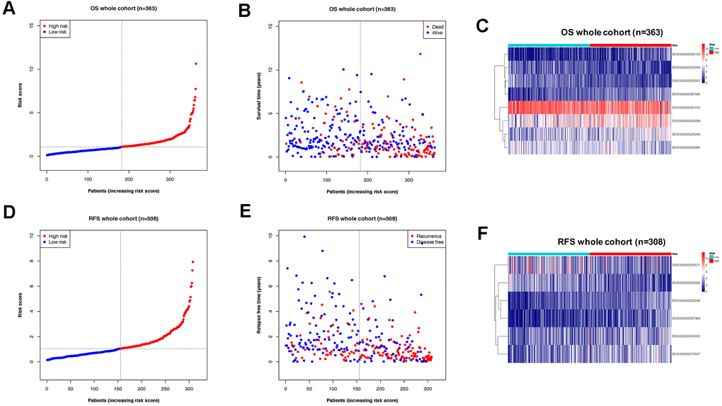 Subsequently, the OS cohort was further divided into two sub-groups (high-risk and low-risk) according to the median value of the risk score calculated by the OS classifier. The distribution of risk scores, the vital status of patients, and expression of element lncRNAs were compared between high-risk and low-risk subgroups of the OS cohort (Figure 3A–3C). The features of the risk score determined by the RFS classifier in the RFS cohort were also shown in a similar manner (Figure 3D–3F).