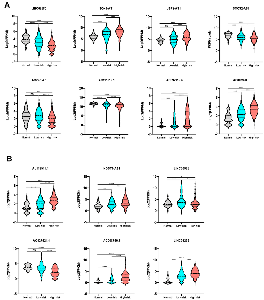 Next, both the OS and RFS cohorts were randomly split into training and validation groups at a 2:1 ratio. The LASSO regression was performed at 20-fold cross-validation in the two training groups to generate an 8-lncRNA-based OS classifier and a 6-lncRNA-based RFS classifier. According to the cut-off median value of the risk score, the OS and RFS cohorts were divided into high- and low-risk groups, then the expression of element lncRNAs within the classifiers in control, low-risk, and high-risk groups were compared.