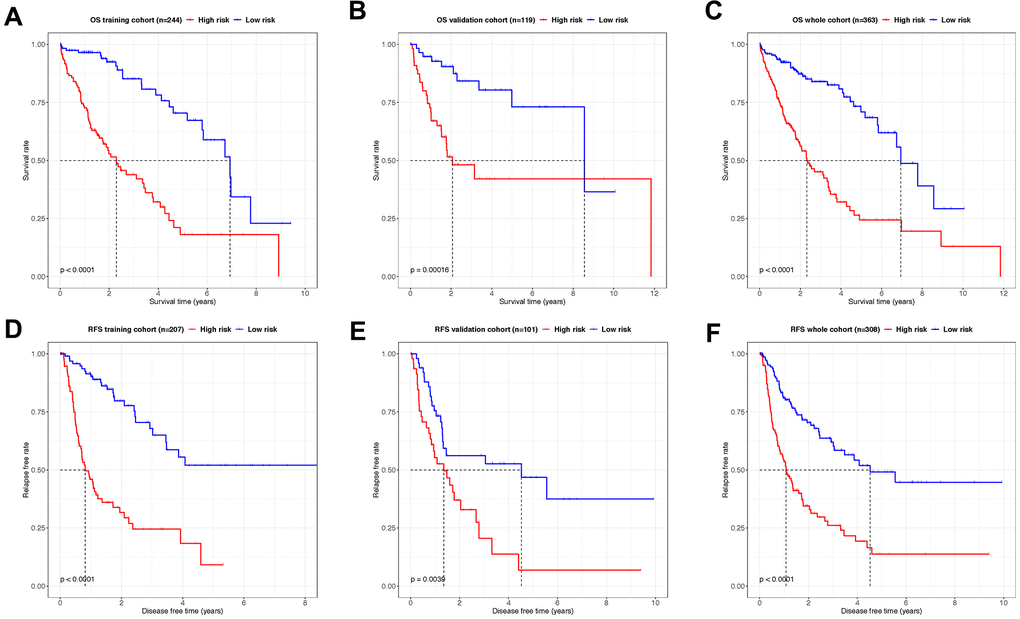 The predictive capacity of both OS- and RFS signatures were evaluated in all the training, validation, and whole cohorts, respectively. Kaplan-Meier log-rank tests were conducted in all 6 groups to confirm the effectiveness and consistency of the model for both OS (Figure 5A–5C) and RFS (Figure 5D–5F) prediction. Unanimously, in all the cohorts with OS and RFS prognostic panels, patients in high-risk groups showed significantly poorer outcomes of either demise or tumor relapse (P < 0.01). These results indicated that the OS- and RFS-classifiers significantly linked with the prognosis of HCC, thus hold the potential as an effective prediction model.