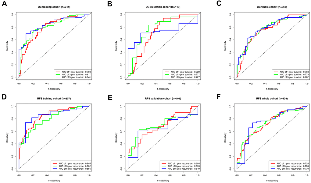 Afterward, the efficiency of both classifiers was checked by the time-dependent receiver operating characteristic (ROC) curve. In the OS cohort, areas under ROC curve (AUCs) of the 8-lncRNA-based classifier reached 0.798, 0.817 and 0.841 for 1, 3, and 5 years in the training group (Figure 6A), 0.729, 0.777 and 0.727 in the validation group (Figure 6B), 0.763, 0.774 and 0.782 for 1, 3, and 5 years in the whole group (Figure 6C). Meanwhile, the AUCs of the 6-lncRNA-based classifier for RFS prediction were 0.845, 0.802, 0.855. for 1, 3, and 5 years in the training group (Figure 6D), 0.688, 0.695, 0.649 in the validation group (Figure 6E), 0.728, 0.733, 0.739 in the whole RFS group (Figure 6F).