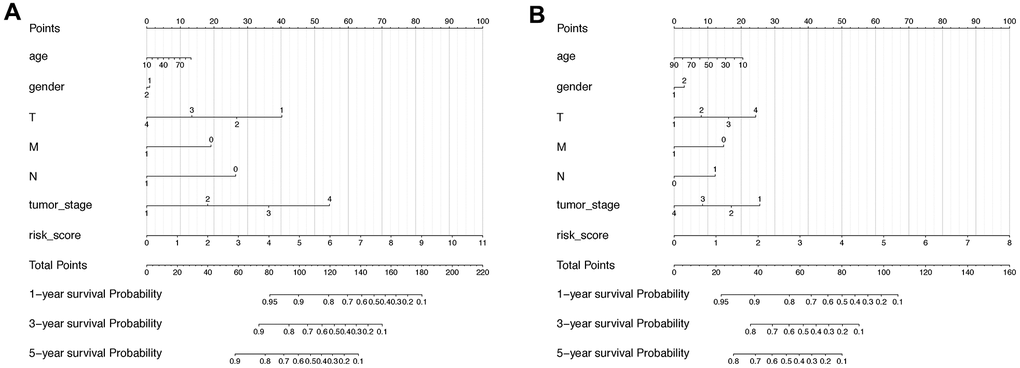 As the lncRNA signatures and several pathological features concordantly showed significant correlation with HCC progression, their combined efforts in predicting HCC prognosis were further check with the Normogram analysis. In specific, the risk score is the most relevant indicator in the diagram with the total points reflecting the final prognostic probability in OS of HCC, while the T status also plays a critical role (Figure 7A). In RFS prognosis, despite the risk score of the lncRNA classifier and the T status remained the major anchor for prognosis, factors such as Age and Tumor stage were interestingly gained more weight on deciding total probability points compared with OS prognosis (Figure 7B).