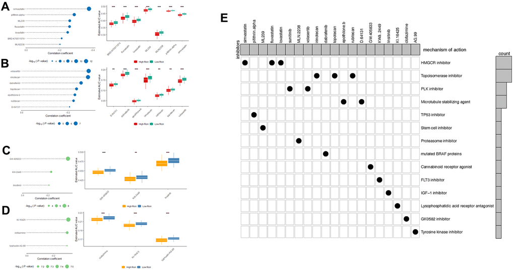 To identify drug candidates for high-risk patients with our LncRNA signature, two different approaches were applied using CTRP and PRISM drug response database separately. The differential drug sensitivity was identified between high- (top 20%) and low-risk (bottom 20%) patients with lower estimated AUC values in high-risk patients (Log2FC >0.05). Following this, the spearman correlation was measured to select the candidates with a negative correlation coefficient (r < -0.2) between risk scores and AUC values with both OS and RFS signatures. With the OS- signature, seven candidates from CTRP and seven candidates from the PRISM dataset were identified (Figure 8A, 8B). And applying the RFS signature, a total of six compounds were screened out from both datasets using the same criteria (Figure 8C, 8D). All candidates were having significantly lower estimated AUC values in high-risk patients. To further investigate the mechanism of these drug candidates, the Cmap mode-of-action (MoA) database including nearly 3000 small-molecule compounds was applied (Figure 8E). The target analysis revealed 14 distinct drug targets in those candidates, and the top enriched targets are HMGCR inhibitors and topoisomerase inhibitors.