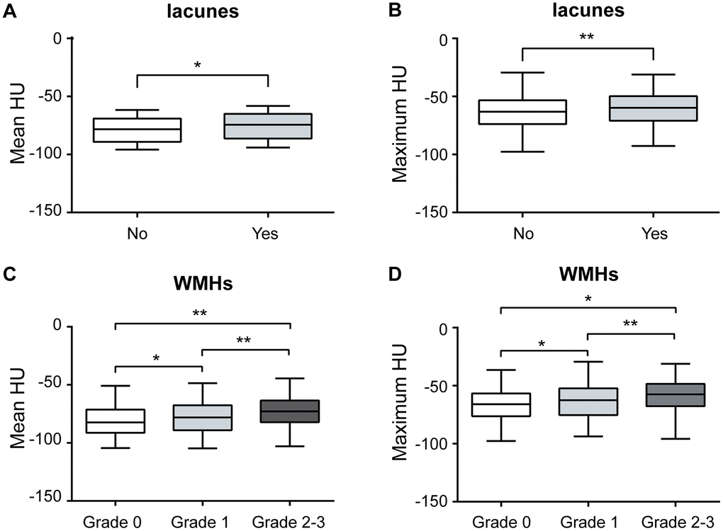 An increased pericarotid fat density was associated with the presence of lacunes (mean HU P=0.005 and maximum HU P=0.023, Tables 2, 3 and Figure 1A, 1B) and a higher WMH grade (both mean and maximum HU P<0.001, Tables 2, 3 and Figure 1C, 1D), and both remained significantly different after adjusting for the other clinical parameters, except for the maximum HU in WMHs (Grade 1). Although there was a difference in the maximum HU across different grades of PVSs, the difference disappeared after adjusting for the other clinical parameters (Table 3). There was no significant difference in the mean HU across the different grades of PVSs (Table 2).