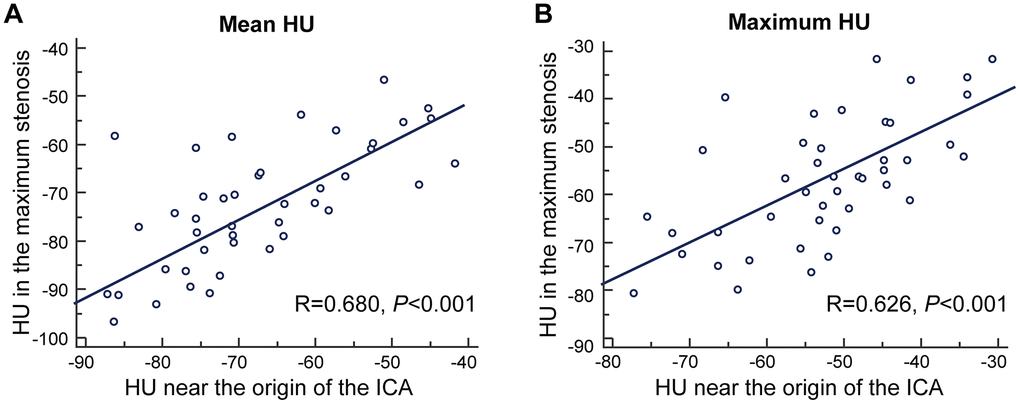 Forty-three subjects had extracranial ICA stenosis, and we recorded the value at the maximum stenosis slice. The pericarotid fat in the slice with maximum stenosis had a higher density than that near the origin of the ICA (mean HU -67.33±12.34 vs. -72.62±12.58, P=0.008 and maximum HU -52.39±11.48 vs. -56.89±13.05, P=0.008). In addition, the mean HU and maximum HU in these two places were strongly correlated (R=0.680, P<0.001 and R=0.626, P<0.001, Figure 2).