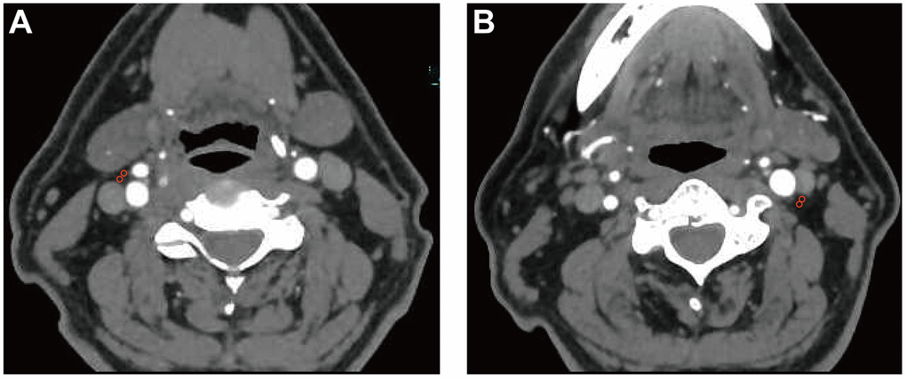 The density of the pericarotid fat surrounding the extracranial ICA can be measured via Hounsfield units (HU) on routine CTA imaging. We referred to an established approach previously described in [2] using predefined image display settings (window width, 500 HU; window center, 100 HU). We placed 2 regions of interest (ROIs) (3 mm2 in diameter) in the perivascular fat on both sides of the ICAs (Figure 3). The ROIs were placed at least 1 mm from the outer margin of the carotid artery wall to exclude the carotid artery wall and surrounding soft-tissue structures. The HU values were recorded from 3 discontinuous slices near the origin of the ICA, and then, the mean and maximum HU values were measured. In addition, if North American Symptomatic Carotid Endarterectomy Trial (NASCET)-defined ICA stenosis was present, we recorded the value at the maximum stenosis slices [33].