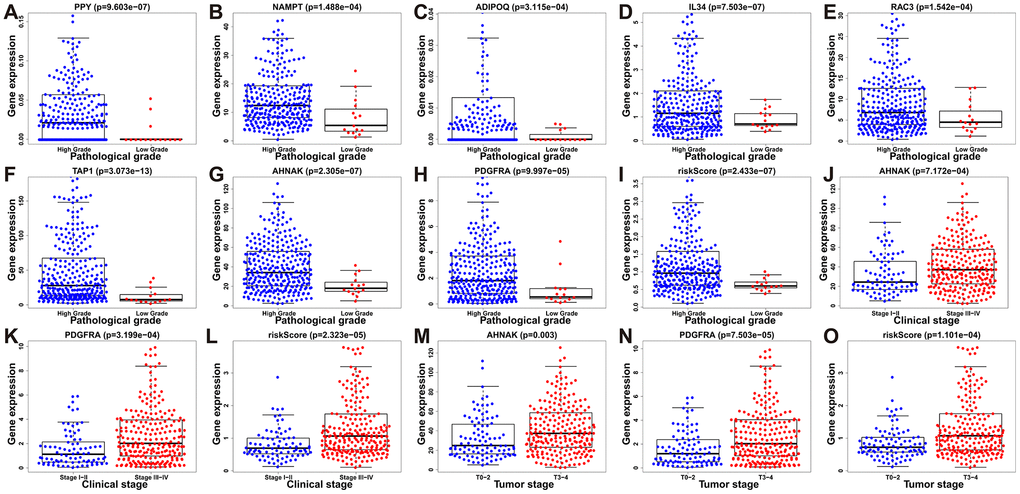 To assess the efficacy of our model in predicting the progression of BLCA, we evaluated the correlations between the risk signatures and clinical parameters including age, sex, pathological grade and clinical stage in the TCGA data cohort (Table 2). As the levels of PPY, NAMPT, ADIPOQ, IL34, RAC3, TAP1, AHNAK, PDGFRA and the risk score increased, the pathological grade of BLCA patients increased (p < 0.01) (Figure 10A–10I). With the increase of the other factors (risk score and PDGFRA and AHNAK levels), the clinical stage and the tumor stage of patients with BLCA also increased (all p < 0.01) (Figure 10J–10O). These results demonstrate that the dysregulation of the expression of the DEIRGs is significantly associated with the development of BLCA.