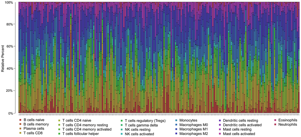 Here we estimated immune infiltration between high and low risk score groups with the LM22 (22 types of immune cells) signature file via the CIBERSORT algorithm. After 1000 permutations of CIBERSORT, the distribution of 22 subtypes of immune cells in each patient was exhibited, along with the p-values, correlation coefficients, and root mean squared error (RMSE), which evaluates the accuracy of the results of each sample.