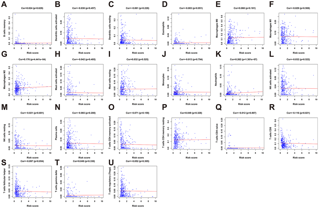 To clarify whether our prognostic risk model can reflect the status of tumor immune microenvironment in BLCA patients, we evaluated the correlation between risk scores and immune cell infiltrations estimated by the CIBERSORT algorithm (Figure 11). The correlations between the risk score of the prognostic signature and immune cell infiltration are shown in Figure 12. As the risk score increased, the numbers of neutrophils, M2 macrophages, and CD8+ T cells in BLCA tissues increased (Figure 12).