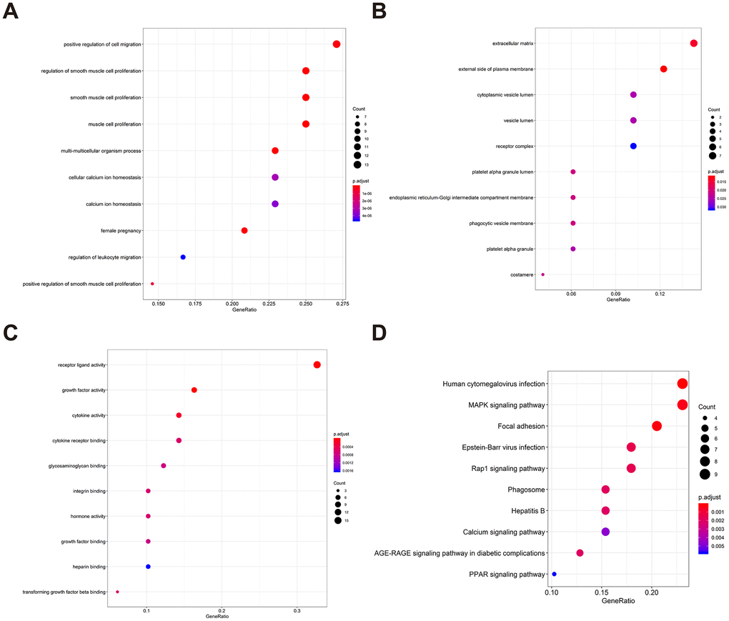 To determine possible prognosis-associated DEIRGs, univariate Cox regression analysis of DEIRGs were performed in the present study. After screening, we identified 51 DEIRGs that significantly correlated with the overall survival of BLCA patients (Figure 2). Similar to the results for the DEIRGs, we found that these prognosis-associated DEIRGs were most enriched in cell migration, cell proliferation, extracellular matrix, receptor ligand activity and growth factor activity (Supplementary Table 2 and Figure 3A–3C). Human cytomegalovirus infection and the MAPK signaling pathway were most enriched in the KEGG analysis (Figure 3D).