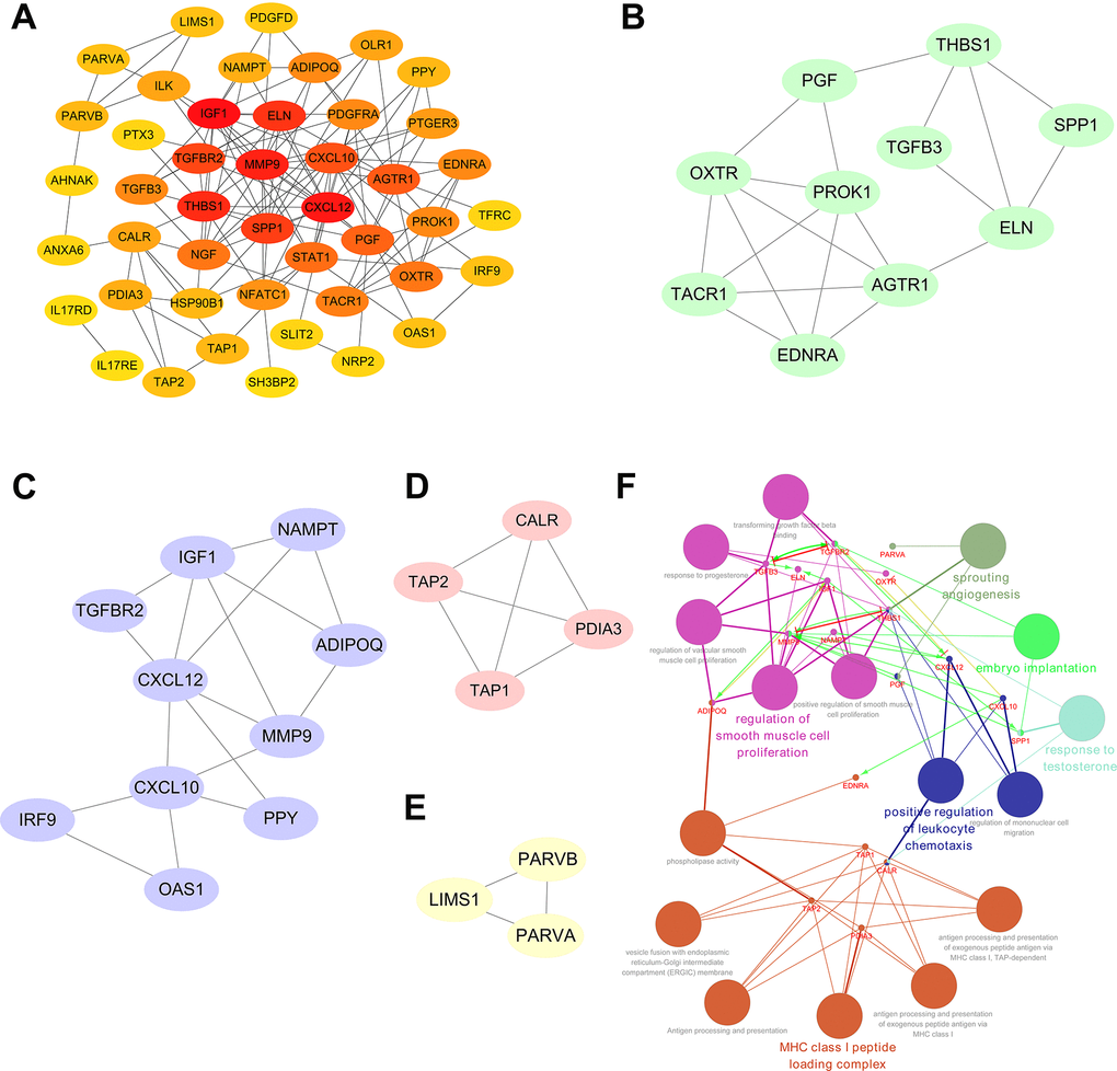 A PPI network was established utilizing the 51 prognosis-associated DEIRGs, shown in Figure 4A. In the PPI network, 27 hub genes were identified by the MCODE plugin of Cytoscape. When the k-core = 2, four significant module subgroups were obtained and were showed in different colors, and the most important modules, including THBS1, PGF, SPP1, TGFB3, ELN, OXTR, PROK1, AGTR1, TACR1, and EDNRA, were marked in green (Figure 4B–4E). As shown in Figure 4F, functional annotation indicated the 27 hub genes were mostly related in sprouting angiogenesis, positive regulation of leukocyte chemotaxis, regulation of smooth muscle cell proliferation, MHC class I peptide loading complex, response to testosterone, and embryo implantation.