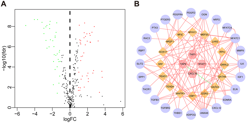 Cistrome Cancer is a comprehensive resource for predicting targets of TFs (http://cistrome.org/CistromeCancer/). Target prediction is based on integration of correlations of expression levels among samples in each cancer included in TCGA, as well as the genomic TF binding patterns included in the ChIP-seq data. The Cistrome Cancer database contains a list of 318 TFs [49]. We analyzed differentially expressed TFs and constructed a regulatory network linking TFs and IRGs.