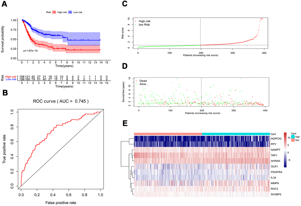 Multivariate Cox regression analysis were performed to calculate a risk score for each patient as follows: Risk score = (−0.0067 ×TAP1(expression)) + (0.0004 ×MMP9(expression)) + (0.0616 ×ADIPOQ(expression)) + (0.0359 ×PDGFRA(expression)) + (0.01261 ×AHNAK(expression)) + (0.0295 ×RAC3(expression)) + (0.0066 ×OLR1(expression)) + (0.0263 ×IL34(expression)) + (0.0149 ×NAMPT(expression)) + (0.0172 ×PPY(expression)) + (−0.0720 × SH3BP2(expression)). Based on the risk scores, patients with bladder cancer were divided into high-risk (n = 186) and low-risk (n = 185) groups. Kaplan–Meier analysis revealed that the survival rate significantly favored the low-risk group (p < 0.001) (Figure 6A). The AUC of the ROC curve was 0.745, suggesting moderate effectiveness for the prognostic risk model for monitoring survival (Figure 6B). Figure 6C–6E represented the risk scores, survival status, and heatmap of the ten IRGs between the two groups.