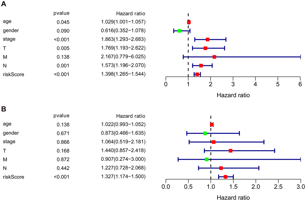 We then performed univariate and multivariate Cox regression analysis to determine the efficacy of risk score derived from our prognostic risk model as an independent predictor after adjusting for other clinical parameters (Table 1). Univariate analysis revealed that age, clinical stage, tumor stage (T), lymph node (N), and risk score were significantly related to the prognosis of BLCA patients (p < 0.05). Multivariate Cox regression analysis demonstrated that the risk score was independently corelated with the overall survival in the cohort (p < 0.001) (Figure 7).
