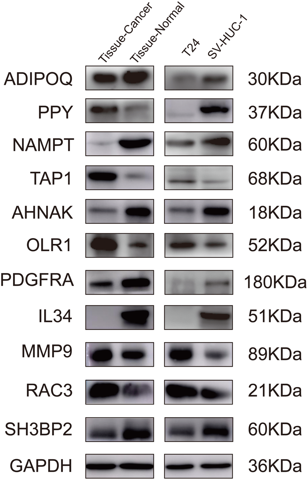 To further validate the proposed signature at the protein level, we performed western blotting on bladder cancer tissues, adjacent tissues, SV-HUC-1, and T24 cells lines. Comparing the gene levels of RNA-seq from TCGA dataset (data not shown) with the expression levels of WB protein, our results indicated that the protein levels of ADIPOQ, NAMPT, TAP1, OLR1, AHNAK, PDGFRA, IL34, MMP9 and RAC3 were consistent with their RNA expression trends (Figure 9).