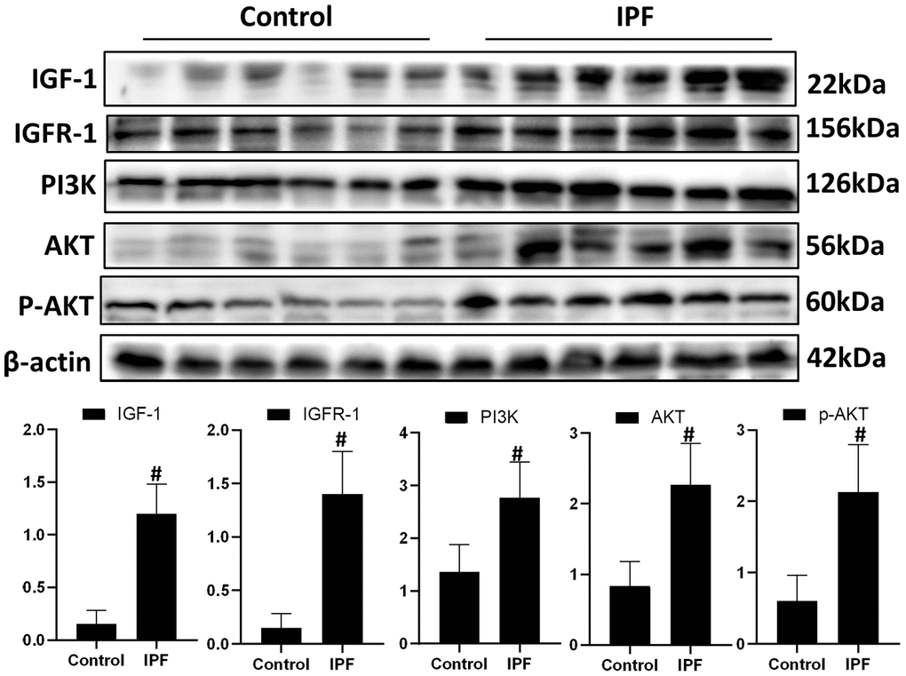 To evaluate the role of IGF1 in IPF, lung tissue from patients with IPF were analyzed for the levels of IGF1 and IGF1/PI3K/AKT signaling pathway members. Western blotting showed that the levels of IGF1, IGFR-1, PI3K, AKT and p-AKT in lung tissues of patients with IPF were significantly higher than those in normal lung tissues (Figure 1). This indicated that the IGF1 signaling pathway is activated in IPF conditions.