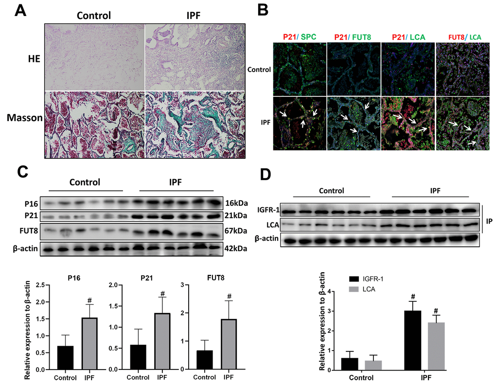 Hematoxylin and eosin (HE) and Masson staining showed that alveolar structure was destroyed and blue stained collagen fibers appeared in the interstitium of the lung parenchyma from patients with IPF compared with that in normal lung tissues (Figure 2A). Immunofluorescence showed that there were significantly increased expression of senescence key protein (P21) in AECs and the increased p21 were accompanied by up-regulated CF (as indicated by FUT8 and LCA levels) (Figure 2B). Western blotting also showed that the levels of senescence key protein (P21, P16) and FUT8 were upregulated in IPF lung tissue (Figure 2C). Immunoprecipitation showed that LCA of IGFR-1 increased significantly in IPF lung tissue (Figure 2D). These results indicated that IPF is associated with AECs senescence, and AECs senescence is accompanied by CF.