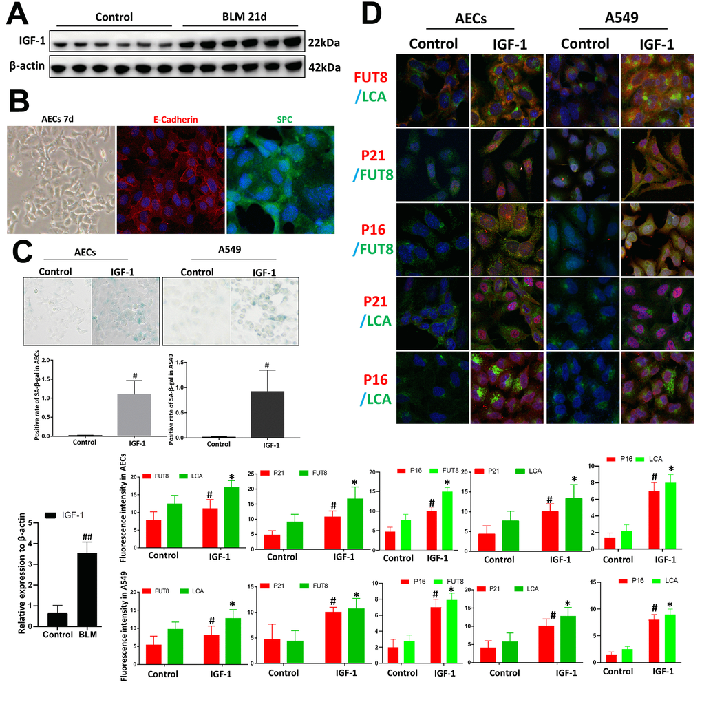 We used BLM mouse model to evaluate the expression of IGF1. Western blotting showed that the level of IGF1 in the lung tissue of BLM mice was significantly upregulated than that of the control group (Figure 3A). To reveal whether CF is involved in IGF1-induced AECs senescence, we extracted primary mouse AECs; the human type II alveolar epithelial cell line A549 was selected as the control. The type II AEC-specific marker surfactant protein C (SPC) and E-Cadherin were analyzed to verify the extracted primary AECs (Figure 3B). IGF1 (10 ng/ml) was used to induce the AEC senescence. Senescence-associated beta-galactosidase (SA-β-Gal) staining showed that after 72 h of IGF1 induction, the rate of positive cells increased significantly, indicating a cellular senescence phenotype induced by IGF1(Figure 3C). Immunofluorescence also showed that P21, P16 levels were upregulated after IGF1 induction. FUT8 and LCA levels were also upregulated, indicating an elevated level of CF (Figure 3D). These results demonstrated enhanced CF in AECs senescence induced by IGF1.