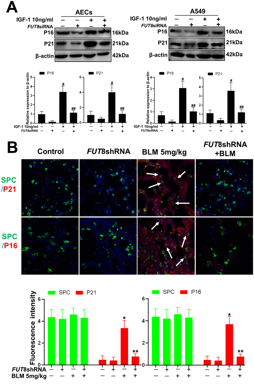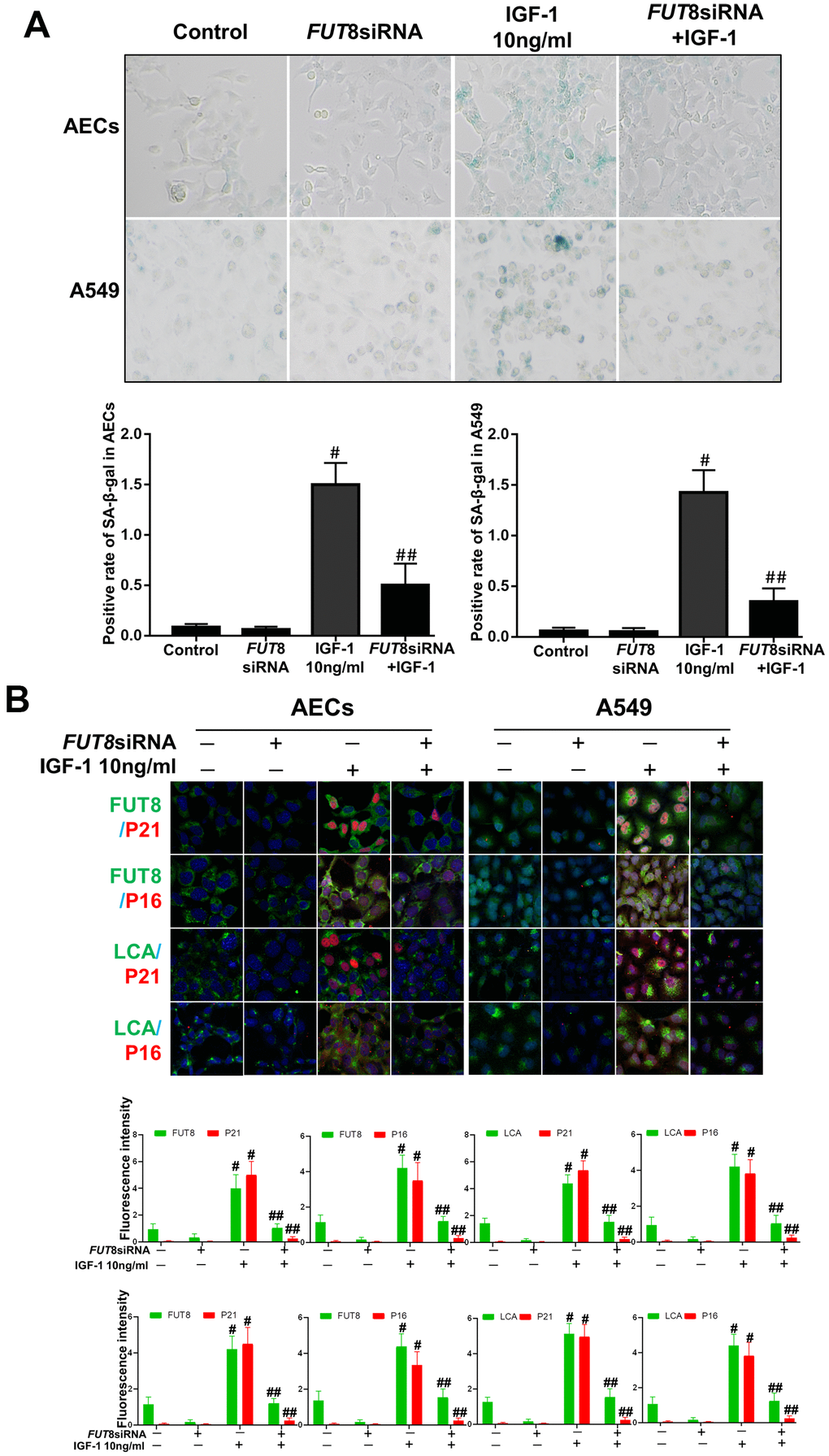 AECs and A549 cells were fixed with freshly prepared 4% paraformaldehyde for 10 min at room temperature. The cells were then washed three times with PBS and mounted on coverslips. Each coverslip was then incubated in 1% BSA. Primary antibodies against P21 (Abcam) and FUT8 (Abcam) were incubated with the cells overnight at 4° C. After washing with PBS, LCA (Vector Labs) and secondary antibodies were incubated with the cells for 1 h at room temperature in a darkened humidified chamber. Finally, each cover slip was washed with PBS, and mounted in fluorescent mounting medium with DAPI. Images were acquired using a confocal laser scanning microscope at a magnification of ×200.