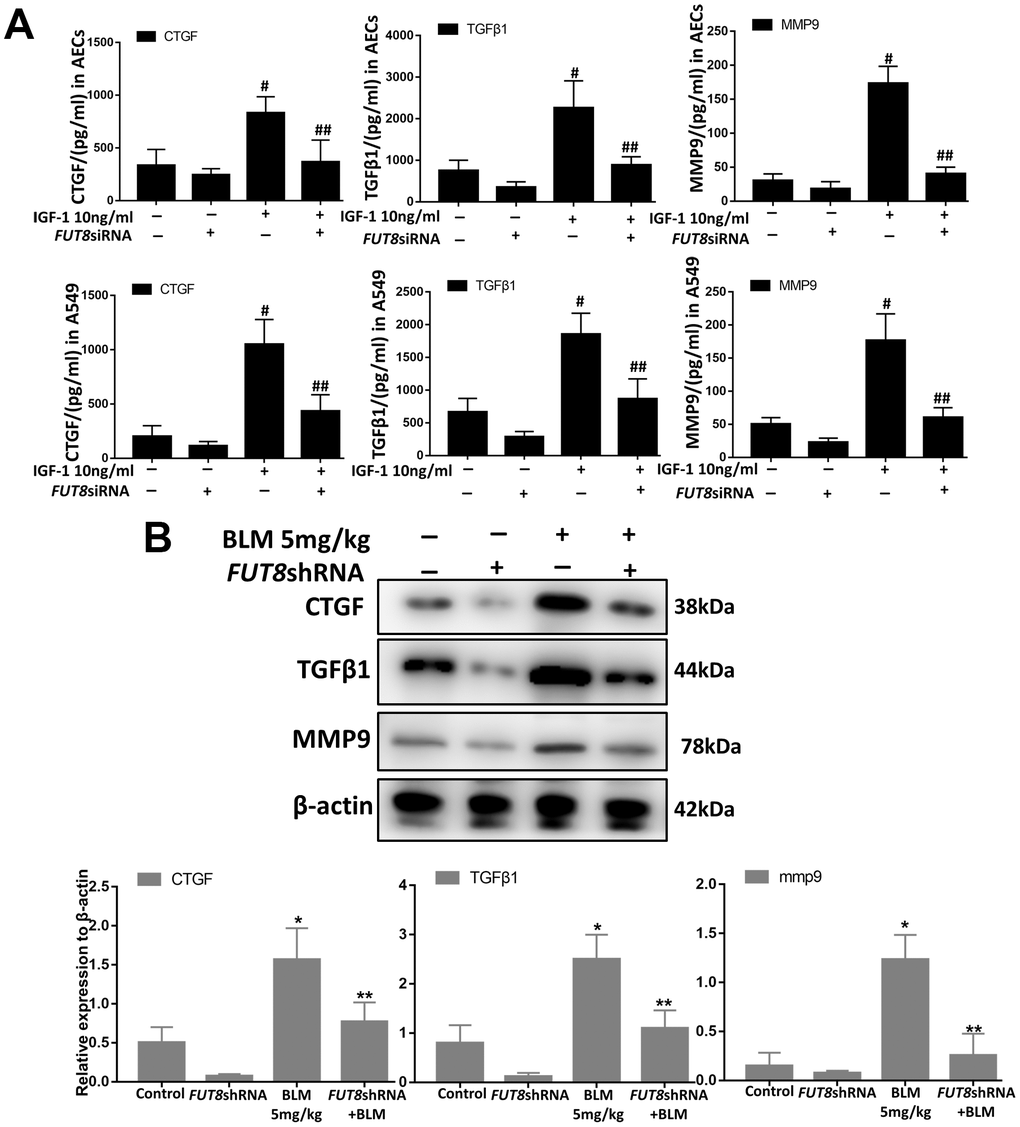 Senescence is often accompanied by senescence associated secretory phenotype (SASP). The results of an enzyme-linked immunosorbent assay (ELISA) showed that the levels of CTGF, TGFβ1, and MMP9 were higher in IGF1-stimulated AECs and in A549 culture supernatants, and CF inhibition by silencing FUT8 reduced the secretion of the above cytokines (Figure 6A). Western blotting showed that the levels of CTGF, TGFβ1, and MMP9 in mouse lung tissue were upregulated significantly by BLM, and their levels were downregulated after inhibition of CF by FUT8 silencing (Figure 6B). These results suggested that inhibition of CF modification can reduce the secretion of CTGF, TGFβ1, and MMP9 in SASP induced by IGF1.