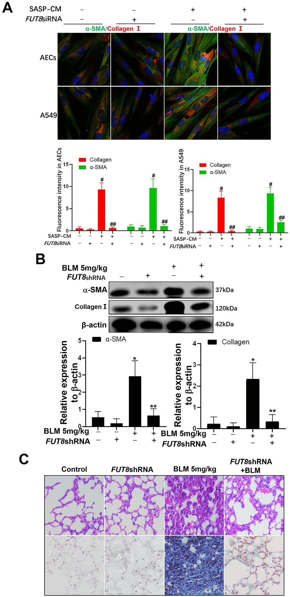 In SASP induced by IGF1, CTGF, TGF-β1, and MMP9 are important cytokines for the transformation from fibroblasts to myofibroblasts in the lung interstitium. The supernatants of senescent A549 and AECs were collected to culture the fibroblast cell line MRC-5 for 3 days. We found that the levels of α-SMA and collagen I, which are hallmarks of myofibroblasts, were both higher in MRC-5 cells cultured in senescent conditioned medium (SASP-CM) compared with those in cells cultured control conditioned medium (CCM). The levels of α-SMA and collagen I were downregulated significantly after the CF was decreased via FUT8 silencing in the SASP-CM group (Figure 7A). Western blotting showed that downregulation of CF reduced the levels of α-SMA and collagen I in the BLM mouse model and alleviated pulmonary fibrosis (Figure 7B, 7C).