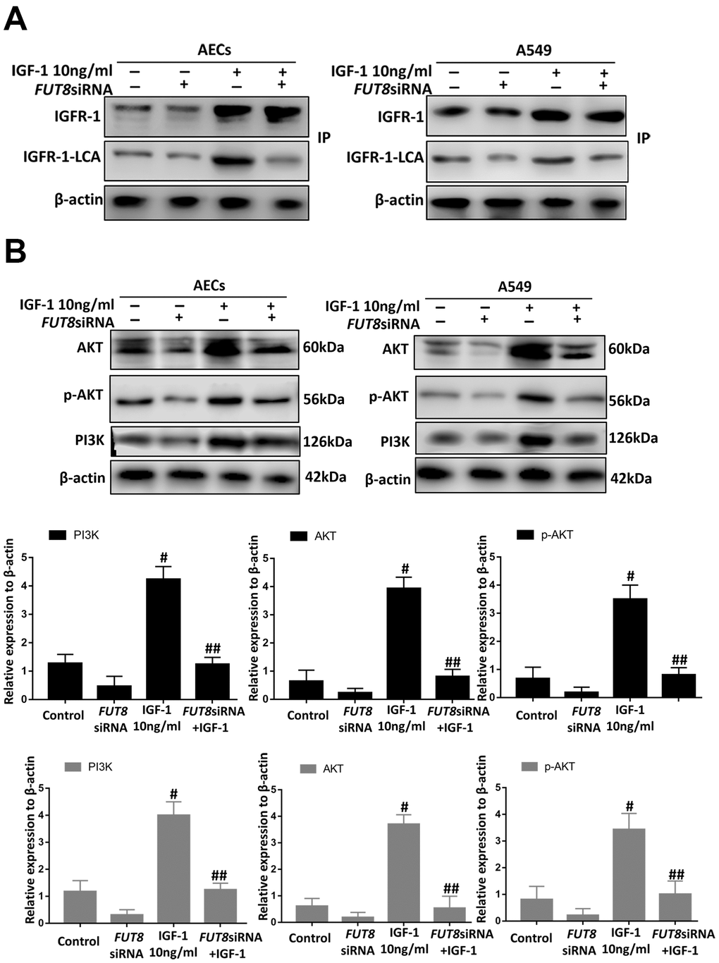Immunoprecipitation of LCA showed that CF of IGFR-1 increased significantly after IGF1 induction over time and was alleviated by FUT8 knockdown in vitro (Figure 8A). Moreover, the levels of phosphorylated PI3K, AKT and p-AKT decreased significantly in response to FUT8 knockdown (Figure 8B). These results suggested that in AECs senescence, activation of IGF1/PI3K/AKT signaling depended on CF.