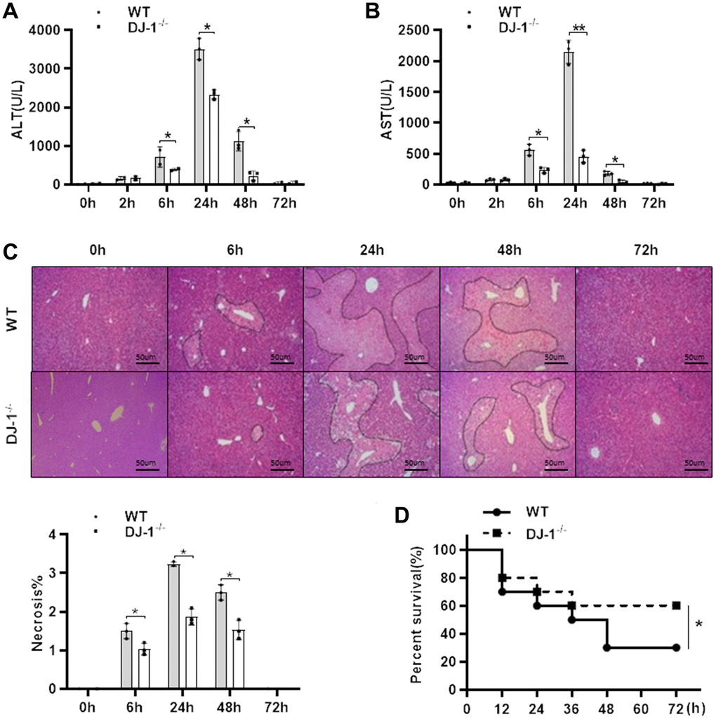 To investigate the role of DJ-1 in the pathogenesis APAP-induced liver injury, a classic hepatotoxic mouse model was used. Fasted wild type (WT) and DJ-1 deficient (DJ-1−/−) mice were intraperitoneal injected with a single dose of 300 mg/kg of APAP. Compared to WT mice, DJ-1−/− mice were more resistant to APAP-induced hepatotoxicity at indicated time points, which exhibited markedly alleviative alanine aminotransferase (ALT) and aspartate aminotransferase (AST) levels (Figure 1A, 1B) and less necrosis area of the liver tissues (Figure 1C) in the first 6 h to 48 h after the intraperitoneal injection of APAP. By intraperitoneal injecting with a single dose of 500 mg/kg of APAP to evaluate the survival rates of both groups of mice, DJ-1−/− mice showed a significantly lower mortality rate relative to WT mice (Figure 1D). These findings suggested that DJ-1 is positively involved in the APAP-induced hepatotoxicity and DJ-1 deficiency could improves APAP-induced liver injury and mortality.