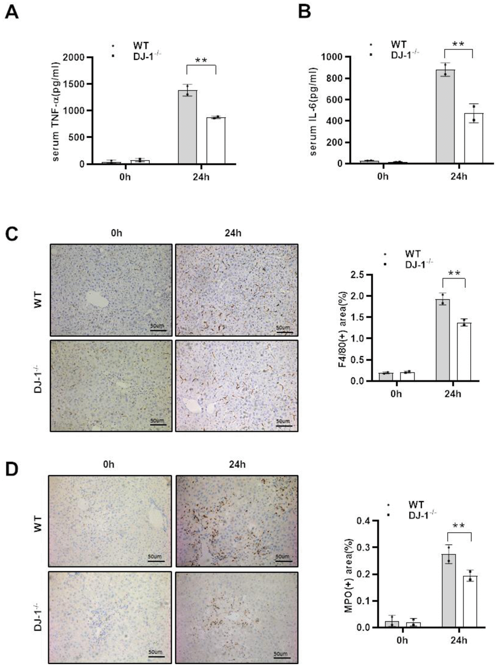 As shown that there were significant differences in hepatocyte damage between the two mice groups, and given that necrotic hepatocytes can result in inflammatory responses activation to subsequently intensify liver damage after APAP injection, we assessed whether DJ-1 deficiency affects the inflammatory response to APAP-induced liver injury at 24 h (the highest levels of ALT and AST and the largest area of necrosis is detected compared with the other time points). As shown in Figure 2A and 2B, there was significantly less serum levels of tumor necrosis factor-α (TNF-α) and IL-6, which were considered as critical pro-inflammatory cytokines, was observed in DJ-1−/− mice compared to that in WT mice at the indicated time point after APAP treatment. Consistently, IHC staining of F4/80 and MPO in the liver also showed less macrophages and neutrophils infiltration in the liver of DJ-1−/− mice at 24 h after APAP treatment (Figure 2C, 2D). These results suggested that ablation of DJ-1 alleviates APAP induced liver injury and inflammatory responses. However it is still not clear that the protective effects of ablation of DJ-1 is through modulating hepatocytes or inflammatory cells response.