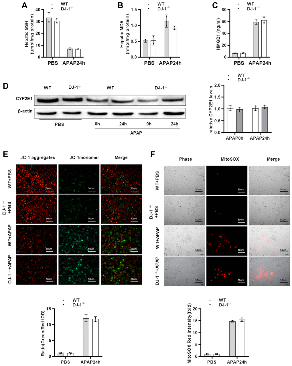In order to investigate whether DJ-1 modulate hepatocytes function during APAP treatment, we checked whether hepatic DJ-1 deficiency could affect APAP metabolism. We first measured hepatic GSH, MDA, HMGB1 levels at 24 h after APAP treatment which are closely related with APAP caused direct hepatocytes injury. As shown in Figure 3A–3C, there were no significant differences between DJ-1−/− and WT mice. Cytochrome P450 2E1 (CYP2E1) plays a central role in APAP metabolism, and subsequently generates metabolic products, such as mitochondrial reactive oxygen species (ROS), caused mitochondrial dysfunction in the early stage of the pathogenesis of APAP-induced hepatotoxicity [4, 9]. We also measured CYP2E1 expression level in the liver. There was no significant difference between DJ-1−/− and WT mice (Figure 3D). These findings suggest that DJ-1 may not affect APAP induced hepatocytes injury. To further confirm this, APAP-induced mitochondrial dysfunction of the primary hepatocytes which were isolated from DJ-1−/− mice and WT mice were investigated. Primary hepatocytes were starved and treated with 5 mM APAP in vitro (treated with PBS as control), and mitochondrial dysfunction of both groups was evaluated by the measurement of mitochondrial membrane potential ΔΨm (JC-1 fluorescent dye) and mitochondrial ROS (MitoSOX Red dye) 24 h after APAP treatment, respectively. As demonstrated by JC-1 and MitoSOX Red signals after APAP treatment, hepatocytes from DJ-1−/− mice showed no different mitochondrial dysfunction compared to that in WT mice (Figure 3E, 3F).