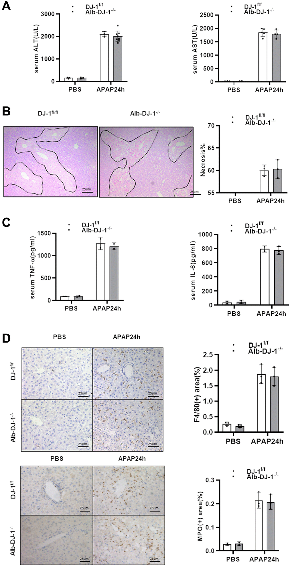 Given that DJ-1 could not directly modulate APAP induced hepatocytes mitochondrial dysfunction and injury, we further generated hepatocyte-specific DJ-1-knockout (Alb-DJ-1−/−) mice by crossing DJ-1fl/fl mice with AlbCre+ mice (Supplementary Figure 1). We investigated whether hepatic DJ-1 deficiency could affect APAP-induced liver injury. As evidenced by the serum levels of ALT and AST, Alb-DJ-1−/− mice showed equivalent liver injury in response to APAP-induced hepatotoxicity compared to DJ-1fl/fl control mice (Figure 4A). Consistently, there were no statistical differences in hepatic necrosis areas between DJ-1fl/fl control mice and Alb-DJ-1−/− mice (Figure 4B). In addition, there were analogous serum levels of proinflammatory cytokines, such as IL-6 and TNF-α, between DJ-1fl/fl and Alb-DJ-1−/− mice (Figure 4C). Furthermore, the results of immunohistochemical staining showed that there were no significant differences in hepatic macrophages and neutrophils infiltration in both genotype mice groups (Figure 4D). All these findings clearly indicated that DJ-1 deficiency in hepatocytes does not affect APAP-induced liver injury.