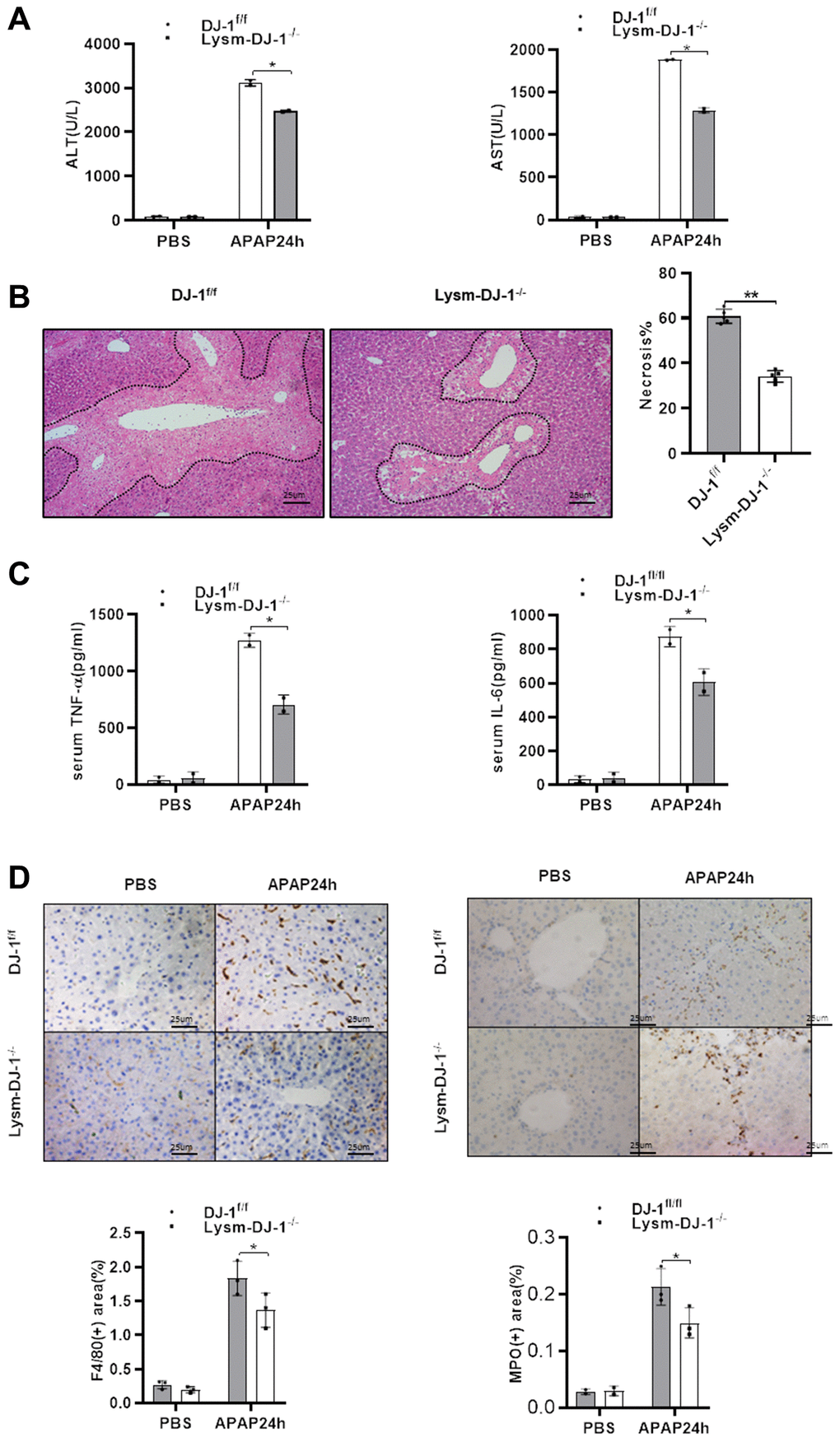 Having demonstrated that hepatic DJ-1 depletion does not protect against APAP-induced hepatotoxicity, we investigated whether DJ-1 deficiency in innate immune cells could prevent from the liver injury. By crossing DJ-1fl/fl mice with LysmCre+ mice, specific myeloid DJ-1 knock-out mice were generated (Supplementary Figure 1). Compared to DJ-1fl/fl control mice, serum levels of ALT and AST, which represented the severity of the hepatic injury, were significantly decreased in Lysm-DJ-1−/− mice (Figure 5A). Liver necrosis areas were also remarkably decreased in Lysm-DJ-1−/− mice (Figure 5B). In addition, the serum levels of proinflammatory cytokines (TNF-α and IL-6), were significantly lower in Lysm-DJ-1−/− mice compared to control mice (Figure 5C). Correspondingly, the results of immunohistochemical staining showed that there were no significant differences in macrophages and neutrophils infiltration in the liver in both genotype mice groups (Figure 5D). These findings indicated that DJ-1 deficiency in innate immune cells plays a protective role in APAP-induced hepatotoxicity.