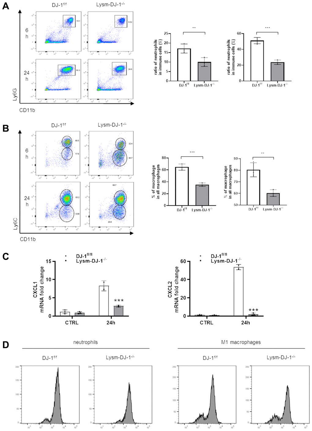 Given that DJ-1 is essential for ROS production in proinflammatory cells [24]. In our study there were no protective effects in hepatocyte-specific DJ-1-knockout (Alb-DJ-1−/−) mice, whereas there were significant protective effects in myeloid DJ-1 knock-out mice, which clearly demonstrated that the protective function of DJ-1 deficiency was through modulating innate immune cells responses during APAP induced liver injury. To further test the inflammatory responses, we isolated intrahepatic immune cells from DJ-1fl/fl and Lysm-DJ-1−/− mice at 6h or 24 h after APAP treatment. By measuring these isolated intrahepatic immune cells, it was shown that there was a decreased population of Ly6G+CD11b+ cells (neutrophils) and Ly6ChighCD11b+ cells (M1 macrophages) in Lysm-DJ-1−/− mice compared to those in DJ-1fl/fl control mice (Figure 6A, 6B and Supplementary Figure 2). Correspondingly, gene expression of the chemokines (CXCL1 and CXCL2) was significantly lower in Lysm-DJ-1−/− mice compared to control mice (Figure 6C). As one of the main activation markers of immune cells, the measurement of the isolated intrahepatic immune cells showed a decreased ROS production in neutrophils and M1 macrophages of Lysm-DJ-1−/− mice, respectively (Figure 6D). These results clearly demonstrated that DJ-1 deficiency caused lower inflammatory response via less ROS production and infiltration of proinflammatory cells, thus alleviate the sterile inflammation in hepatic necrotic areas, which may result in the improved liver injury in Lysm-DJ-1−/− and DJ-1−/− mice induced by APAP overdose.