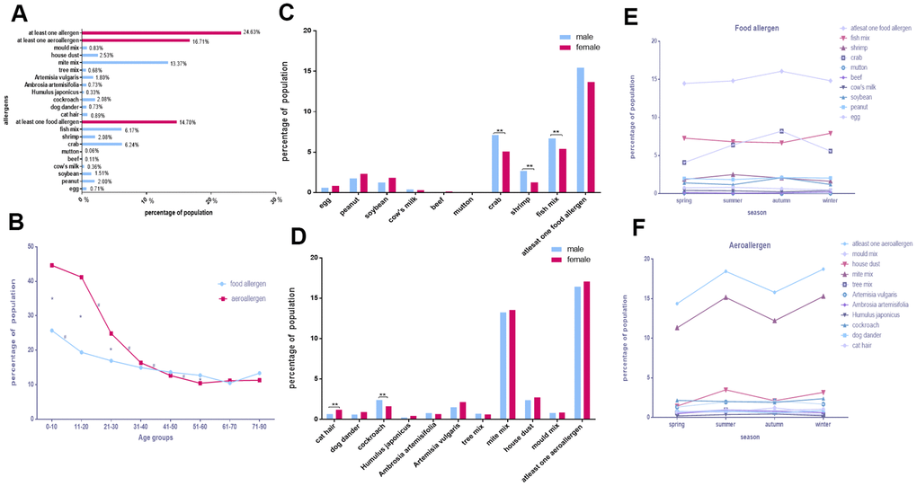 Some single allergens showed remarkably higher levels in males than in females. These included crab (OR, 1.292; 95% CI, 1.128–1.480), fish mix (OR, 1.283; 95% CI, 1.122–1.467), shrimp (OR, 1.648; 95% CI, 1.341–2.025), mite mix (OR, 1.165; 95% CI, 1.062–1.279), tree mix (OR, 2.041; 95% CI, 1.565–2.661), and Ambrosia artemisifolia (OR, 2.037; 95% CI, 1.559–2.661; p < 0.0025 for all; Figure 2C, 2D and Table 4).