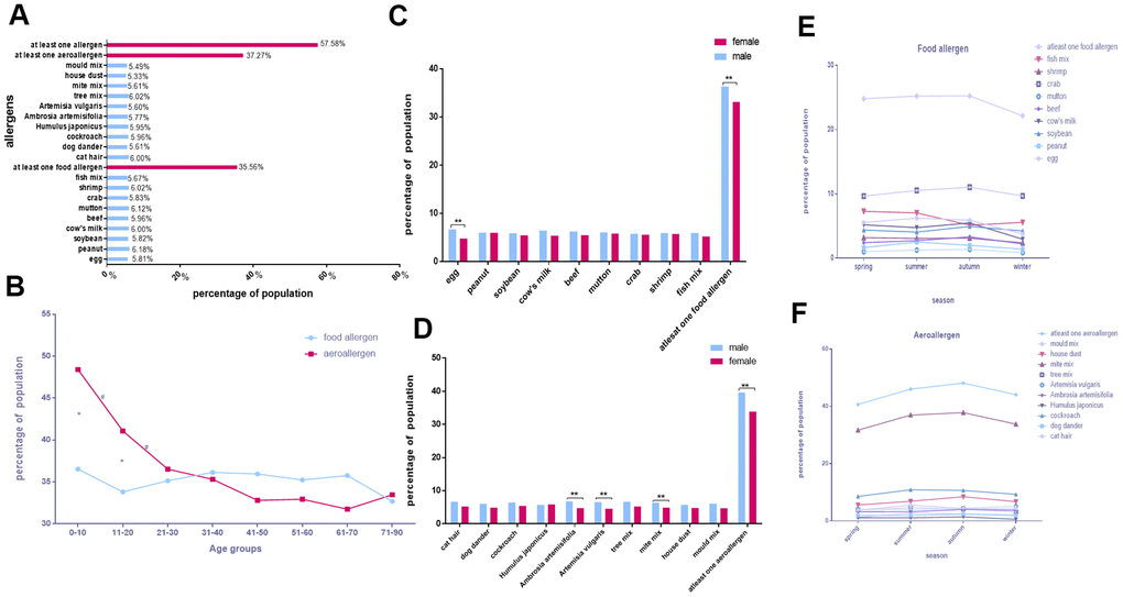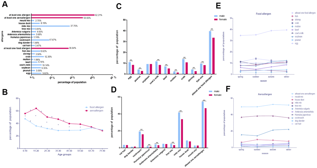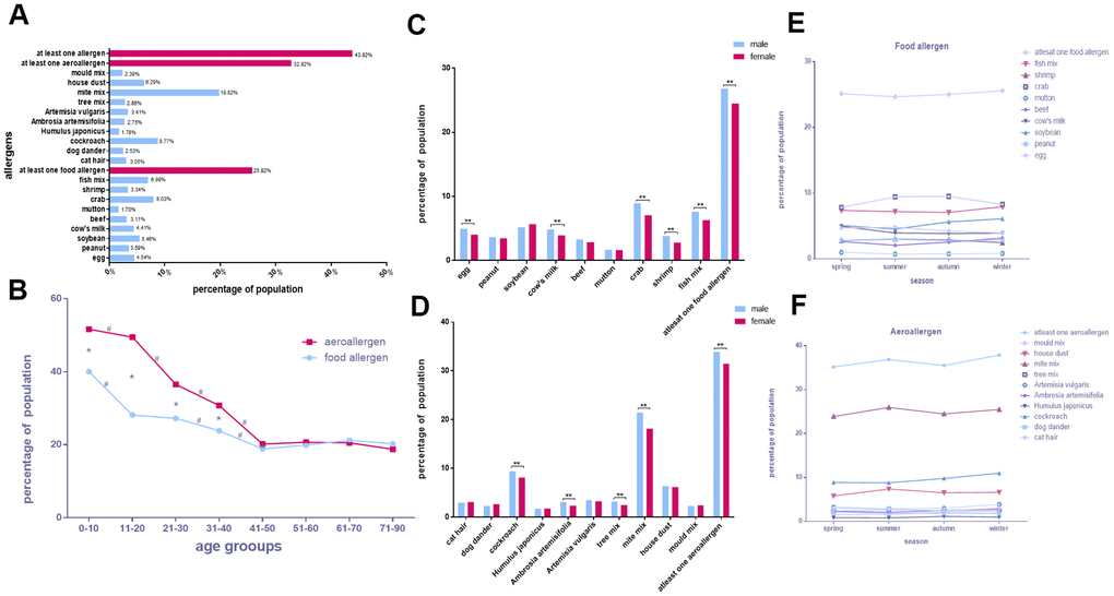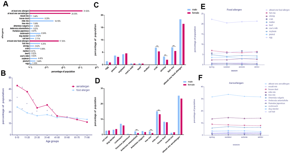 Of the 14,612 participants in Chongqing (46.41% male, 53.59% female), 31.56% were sensitive to at least one allergen. The single allergens with the top five sensitivities were mite mix (14.19%), house dust (8.29%), cockroach (6.54%), fish mix (6.25%), and crab (6.08%; Figure 2A).