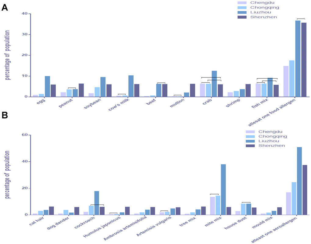 Because of their similar diet and living habits, we found no difference between Chengdu and Chongqing in the rate of IgE for single allergens such as cow’s milk, mutton, crab, fish mix, mite mix, A. vulgaris, and H. japonicus (p > 0.0083), and the top three allergens in both were mite mix, crab, and fish mix. However, the serum house dust allergen-specific IgE positive rate in Chongqing was higher than in Chengdu, possibly because Chongqing is close to the mountains.