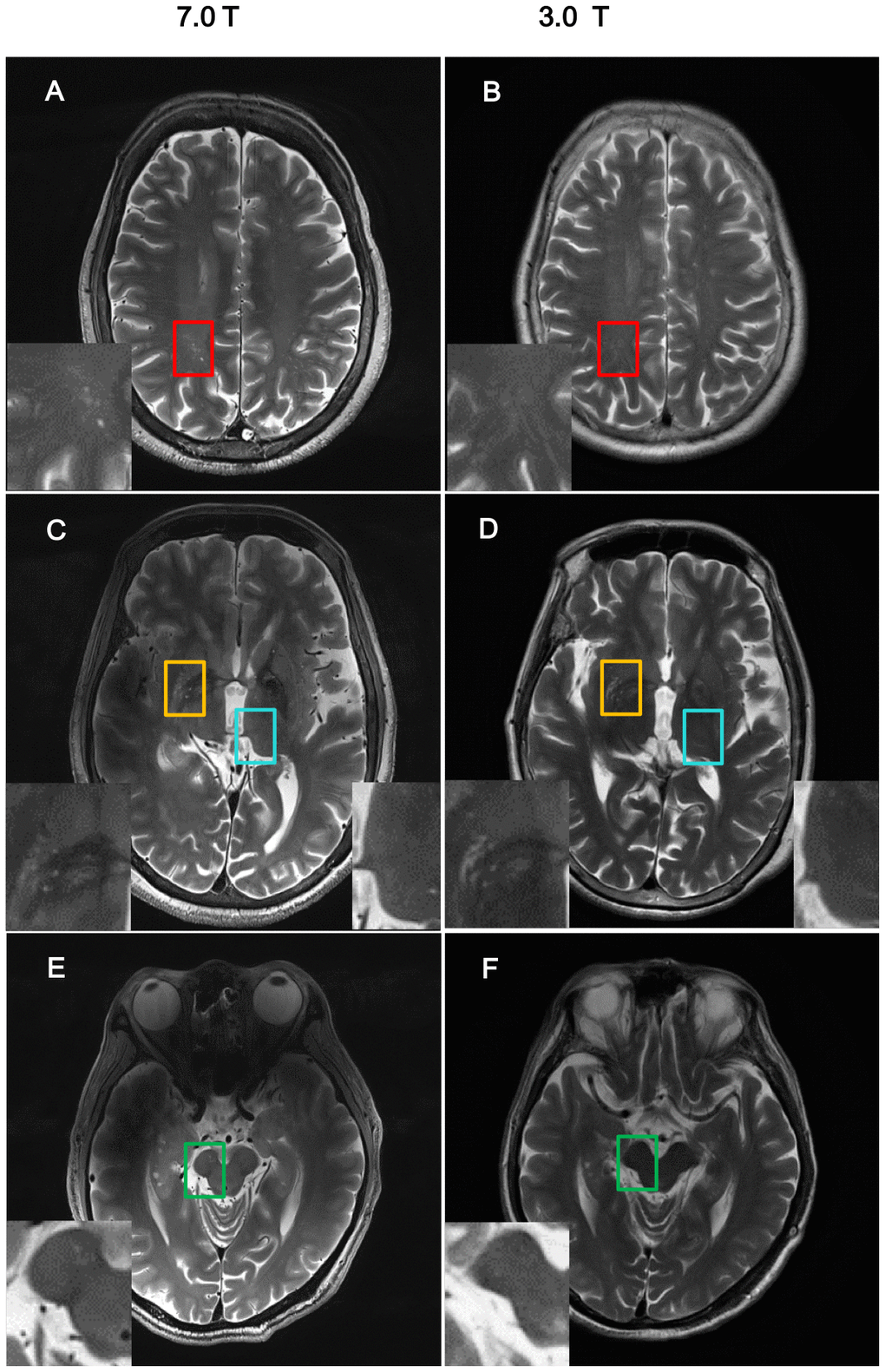 Since ePVSs are correlated with PD motor and cognitive impairment, one can postulate that the distribution and volume of the normal-sized PVSs (nPVSs) may have certain clinical significance in PD. Previous studies have mainly focused on ePVSs due to limits in imaging resolution. NPVSs are typically invisible due to small size in the range of 0.13-0.96 mm [39]. Seven Tesla (7T) MRI, with increased spatial resolution and signal-to-noise ratio, increases the detection of nPVSs [40, 41]. The 7T sequences have been optimized to provide detailed assessment of distributions of nPVSs in the white matter and subcortical nuclei [42].