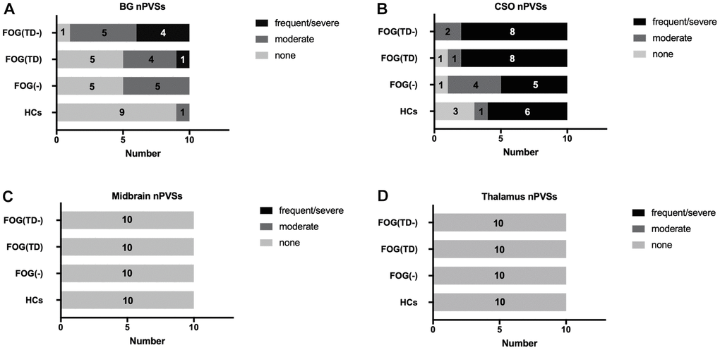 The nPVS numbers of the right and bilateral BG were significantly higher in the FOG(TD-) group than the rest of the groups using one-way ANOVA (Table 2 and Figure 2). The volume of the nPVS of FOG(TD-) group was significantly higher than the other groups when compared unilaterally, bilaterally or choosing a single slice with the highest count (Table 2). No differences were detected in thalamus, CSO, or midbrain regions among the groups. No moderate or severe nPVS burden was seen in the thalamus or midbrain using the scale system previously described (Figure 2) [43].