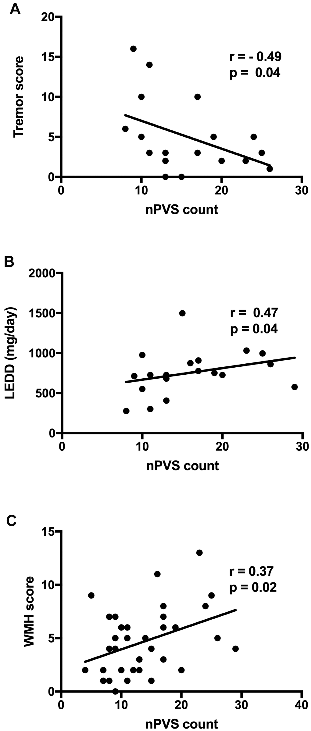 Statistical analysis was performed with SPSS statistics (Version 22, IBM Corporation, Armonk, NY, USA). Categorial variables were analyzed with Fisher’s exact test. Continuous variables were analyzed with One-way ANOVA. Correlation analyses between nPVS burdens, nPVS number and volume, and clinical features, namely MMSE, HAMA, HAMD, UPDRS-III and LEDD, were conducted using spearman correlation analysis. In addition, we also analyzed the correlation between nPVS number of BG and WMH burden. P < 0.05 was considered to define statistical significance.