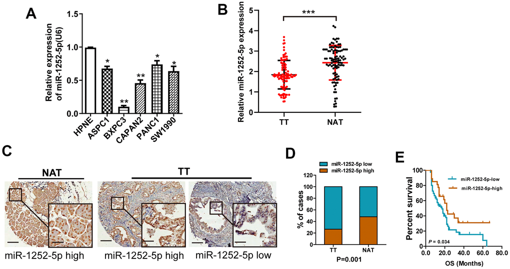 Using qRT-PCR, we first assessed miR-1252-5p expression levels in cell lines (ASPC-1, CAPAN-2, SW1990, Panc-1, BxPC 3, and HPNE cells). MiR-1252-5p expression was significantly reduced in the 5 PAC cell lines than HPNE cells (Figure 1A). Moreover, expression of miR-1252-5p in TT from 102 patients was markedly lower than that in matched NAT (P < 0.001; Figure 1B). Expression of miR-1252-5p was also assessed in a tissue microarray (TMA) containing 102 human TT and matched NAT pancreatic specimens using ISH. According to the calculated staining score, the expression levels of miR-1252-5p were significantly lower in TT compared to NAT (P < 0.001; Figure 1C, 1D).