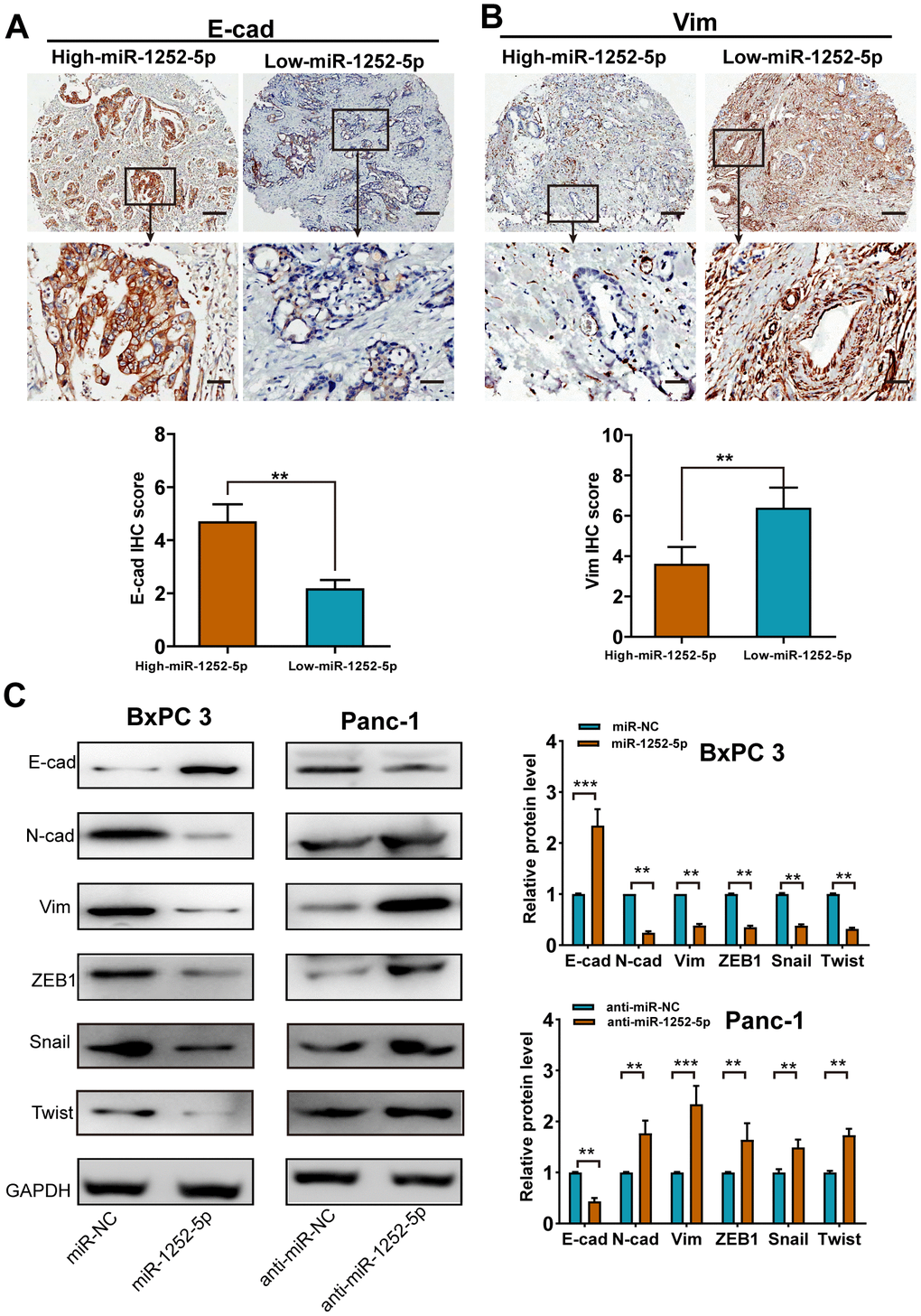 It is well established that epithelial-to-mesenchymal transition (EMT) is linked to the proliferation and invasion of various cancer types, including PAC [9]. During EMT, epithelial cells are transformed to have an invasive mesenchymal phenotype [10] and exhibit changes in expression of EMT markers: downregulated E-cadherin (E-cad) and upregulated Vimentin (Vim) and N-cadherin (N-cad). Additional transcription factors, including Twist, the Snail/Slug family, and ZEB1/ZEB2, act as molecular switches in the EMT process [10]. EMT-regulating miRNAs, including miR-200c and miR-21, have been increasingly reported in association with cancer [11]. Mostly, miRNAs negatively regulate EMT, with only a small number of them (such as miR-21) inducing EMT. However, the association between miR-1252-5p and EMT in PAC has not been investigated.