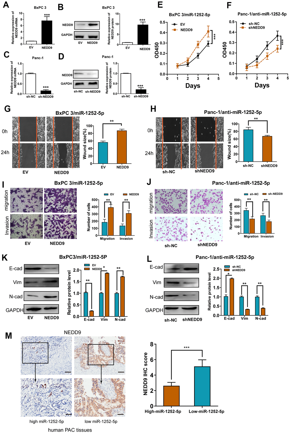 All tissues were confirmed by pathological analysis and immediately frozen in liquid nitrogen and stored at -80° C. According to the manufacturer's instructions, TRIzol reagent (Invitrogen, Carlsbad, CA, USA) was used to extract total RNA from TTs, NATs, and PAC cell lines. qRT-PCR was performed using a SYBR® Premix Ex Taq kit (Takara Bio Inc., Shiga, Japan) and a 96-well real-time PCR system (Bio-Rad Inc., Hercules, CA, USA). GAPDH or U6 snRNA was used as a loading control. The primers for miR-1252-5p were purchased from Sangon Inc., (Shanghai, China), and the details of the primers for GAPDH, NEDD9, E-cad, N-cad, ZEB1, Twist, Snail, and Vim are listed in Supplementary Table 1. Relative gene expression was calculated from the qRT-PCR data using the 2 −ΔΔCT method.