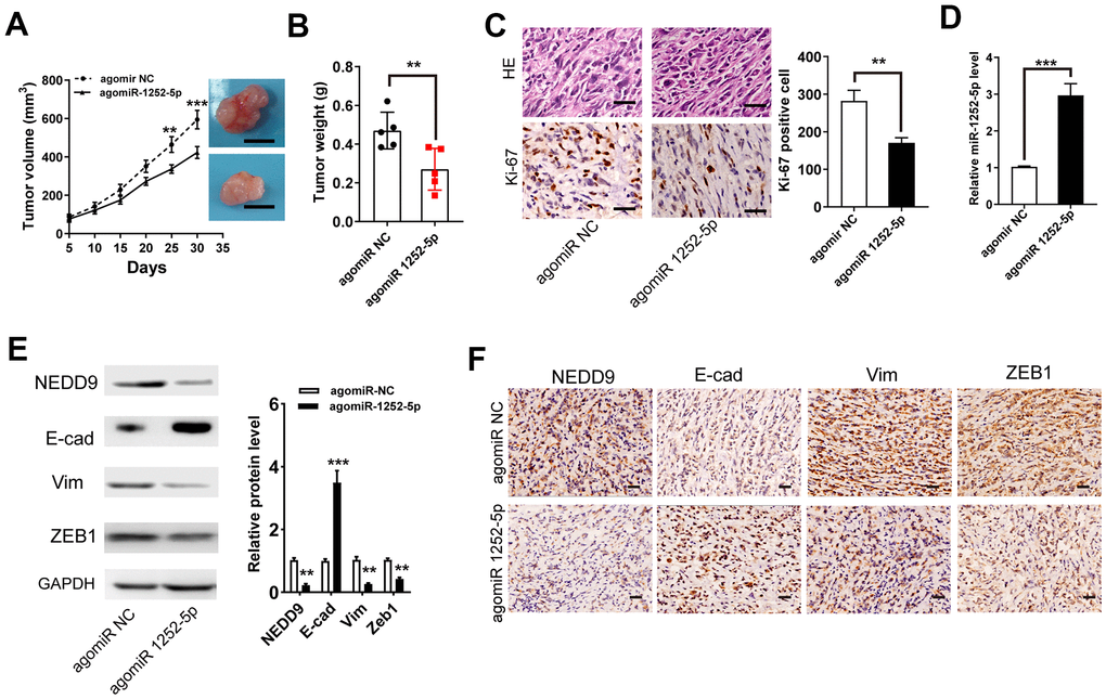 To validate the functions of miR-1252-5p in the growth of PAC in vivo, we performed a mouse xenograft experiment. As exhibited in Figure 6A, 6B, agomiR 1252-5p treatment significantly suppressed tumor volume (Figure 6A) and weight (Figure 6B). IHC staining of Ki-67 clarified that agomiR 1252-5p treatment markedly decreased tumor proliferation (Figure 6C). Furthermore, qRT-PCR assay verified enhanced levels of miR-1252-5p expression in tumors with agomiR 1252-5p-treatment compared with control tumors (Figure 6D). Importantly, western blot and IHC staining assay analysis confirmed that agomiR 1252-5p treatment markedly decreased protein expression of NEDD9, E-cad, Vim, and ZEB1 in the xenograft tumors (Figure 6E, 6F).