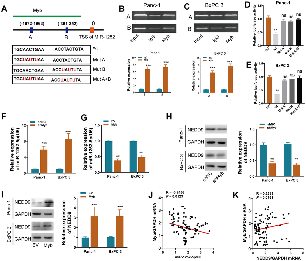 We used the JASPER bioinformatics software program to search a 2 kb region upstream of the transcription start site (TSS) of miR-1252. Two Myb-binding motifs from 1963 to −1972 and −352 to −361 were identified, named A and B (Figure 8A), and ChIP assay confirmed that Myb protein was indeed recruited to these two binding sites in both cells (Figure 8B, 8C). Next, reduced luciferase activity in the wt miR-1252 promoter was observed after overexpression of Myb in both cells (Figure 8D, 8E). These effects were not observed when the A and/or B sites were mutated. We found that ectopic expression of Myb inhibited, while silencing of Myb increased, miR-1252-5p expression in PAC cells (Figure 8F, 8G). On the contrary, expression of NEDD9 protein in PAC cells was decreased or increased after expression of Myb was silenced or upregulated, respectively (Figure 8H, 8I). Furthermore, Myb expression was inversely correlated with miR-1252-5p expression, but positively with NEDD9 expression in human PAC tissues (Figure 8J, 8K).