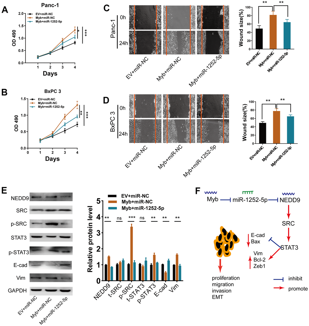 We then explored if miR-1252-5p played a role in the Myb-induced phenotypes in PAC cells. Myb overexpression significantly increased PAC cell growth (Figure 9A, 9B), migration (Figure 9C, 9D), while miR-1252-5p overexpression reversed these effects. Furthermore, ectopic Myb significantly enhanced NEDD9 expression, the activation of SRC/STAT3 pathway, and the EMT process, while miR-1252-5p overexpression significantly attenuated these effects (Figure 9E). These findings indicated that miR-1252-5p counteracted Myb- induced PAC growth, EMT process, and the subsequent activation of SRC/STAT3 via targeting NEDD9.