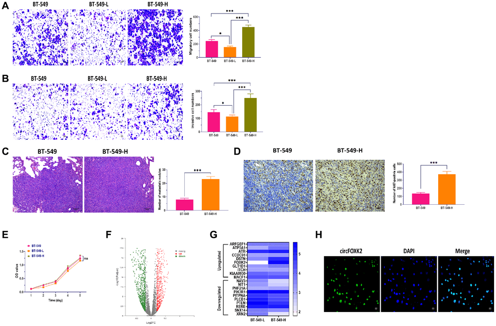 To investigate the mechanism by which BC cells are highly metastatic, we established two BT-549 cell populations with high and low potential of metastasis (BT-549-H and BT-549-L), as previously described [20, 21]. Then, we determined the characteristics of BT-549-H and BT-549-L cells. The results showed that BT-549-H cells had a higher level of migratory and invasive abilities compared with BT-549-L and BT-549 cells (Figure 1A and 1B). Also, injecting through the tail vein of mice, we found more lung metastasis and higher expression of Ki67 in mice injected with BT-549-H cells relative to BT-549-L (Figure 1C and 1D). As showed in Figure 1E, both cell populations showed similar cell viability. Next, RNA sequencing analysis was carried out to determine the differentially expressed circRNAs associated with metastasis of BC cells, as showed in a volcano plot (Figure 1F). By performing qRT-PCR, we measured the expressions of the top 10 upregulated and downregulated circRNAs, respectively. The results showed that circFOXK2 displayed the highest upregulation in BT-549-H, compared with BT-549-L (Figure 1G). Though analysis in database circBase [22], CircAtlas [23], and CircFunBase [24], circFOXK2, also named hsa_circ_0000816, was 343 nt in length and located in FOXK2 2–3 exons. Moreover, circFOXK2 was primarily expressed in the nuclei of BT-549 cells, as determined by RNA fluorescence in situ hybridization (FISH) assay (Figure 1H).