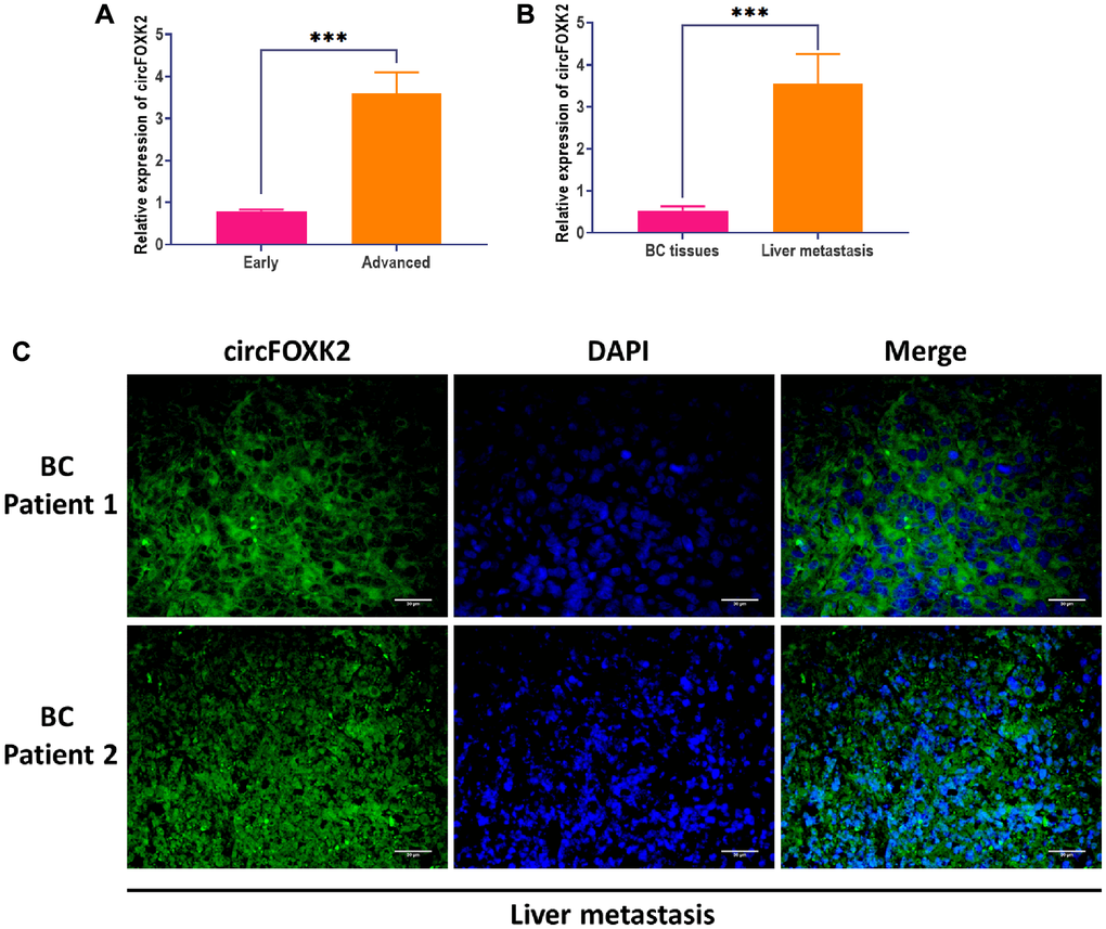 To explore the role of circFOXK2 in metastasis of BC, we measured the expression of circFOXK2 in BC tissues and found that the level of circFOXK2 was significantly higher in advanced-stage tissues compared with early-stage (Figure 2A). Correlation analysis suggested that the upregulation of circFOXK2 was correlated with invasive histological type, lymph node metastasis, and advanced stage. For liver metastasis, the expression of circFOXK2 was higher in metastatic liver tissues compared with paired BC tissues (Figure 2B), which was verified through FISH assay (Figure 2C). These results together indicated that circFOXK2 is associated with metastasis of BC.