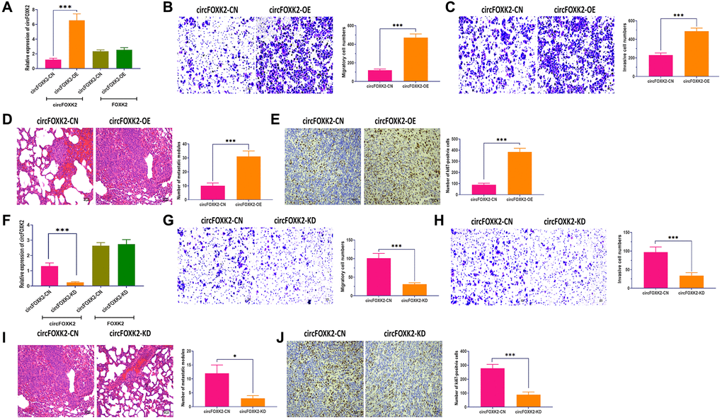 To further explore the effect of circFOXK2 on BC metastasis, we applied the plasmid of circLONP2 and circFOXK2-specific anti-sense oligonucleotide (ASO) to overexpress and knockdown the expression of circFOXK2, respectively (Figure 3A and 3F). Meanwhile, the overexpress and knockdown circFOXK2 did not influence the expression of FOXK2 mRNA (Figure 3A and 3F). In migration and invasion assays, BT-549 cells with overexpression of circFOXK2 displayed significantly increased migratory and invasive abilities compared with control cells (Figure 3B and 3C). Also, the upregulation of circFOXK2 led to a higher level of lung metastasis and Ki67 in the mouse model (Figure 3D and 3E). On the other hand, the downregulation of circFOXK2 displayed the opposite roles (Figure 3G–3J). Therefore, the results collectively demonstrated that circFOXK2 plays an essential role in BC metastasis.