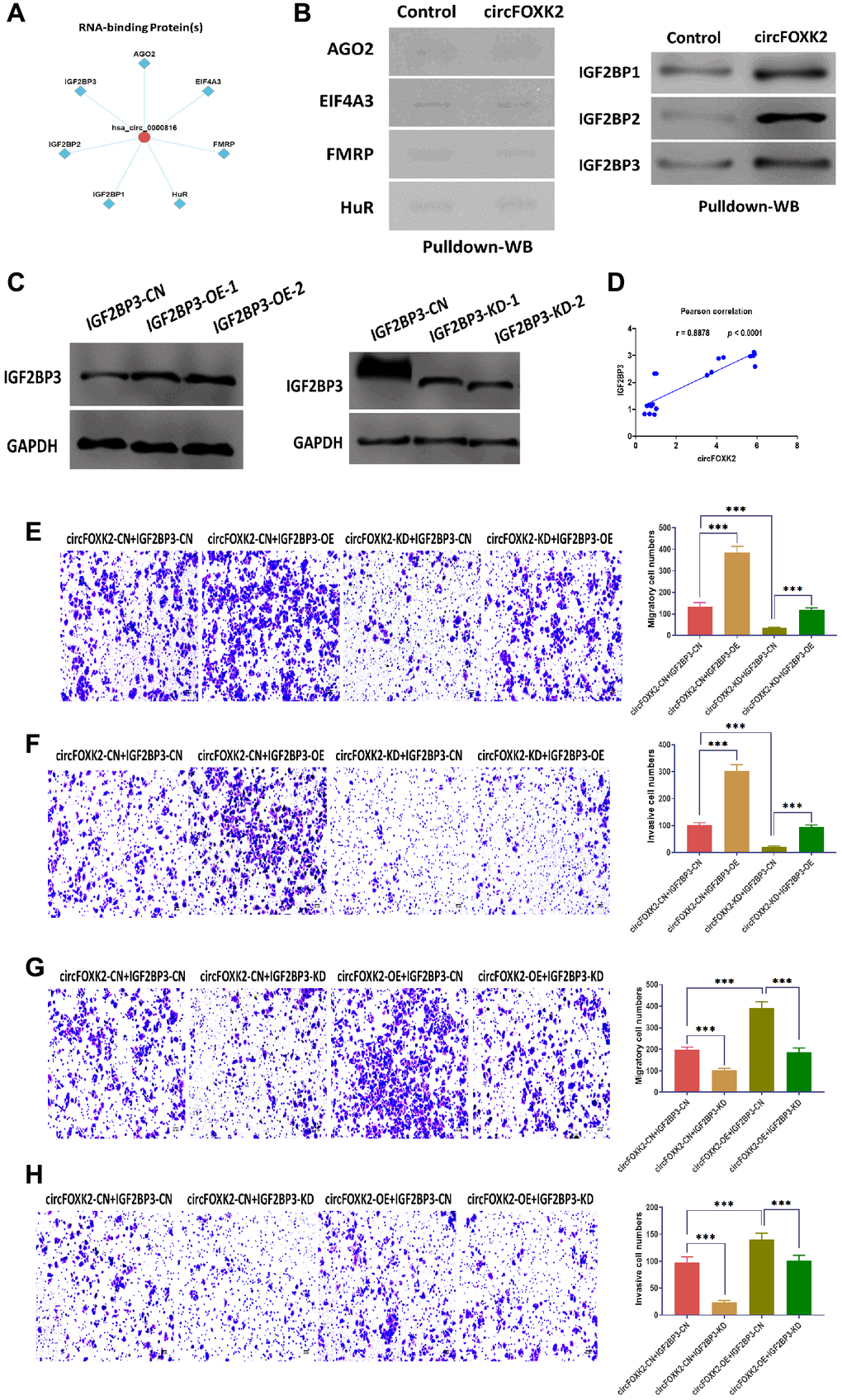 It has been demonstrated that RNA-binding proteins (RBPs) are critical for the function of circRNAs [25]. According to predictions of CircFunBase [24], several potential RBPs might be involved in the role of circFOXK2, including EIF4A3, FMRP, HuR, AGO2, and IGF2BP1-3 (Figure 4A). Of which, IGF2BP family has been reported to be essential to cancer development and progression [26–28]. By using RNA pulldown and Western blotting assays, the results showed that circFOXK2 physically interacted with three IGF2BP family members, including IGF2BP1, IGF2BP2, and IGF2BP3, but not with EIF4A3, FMRP, HuR, and AGO2 (Figure 4B). Among three, IGF2BP3 acts as a critical factor in the regulation of cancers, such as tumor cell proliferation, invasion, and chemoresistance [29]. Thus, we speculated that IGF2BP3 might be an essential RBP mediating the effect of circFOXK2 in BC metastasis. In our rescue experiments, IGF2BP3 was overexpressed and inhibited successfully in BT-549 cells (Figure 4C). The expression of circFOXK2 positively correlated with the protein level of IGF2BP3 (Figure 4D). Also, the overexpression of IGF2BP3 promoted cell migration and invasion and reversed the effect of knockdown of circFOXK2 in BT-549 cells (Figure 4E and 4F). Meanwhile, the downregulation of IGF2BP3 attenuated the effect of overexpression of circFOXK2 on migration and invasion of BC cells (Figure 4G and 4H). These results showed that IGF2BP3 is essential for the effect of circFOXK2 on BC metastasis.
