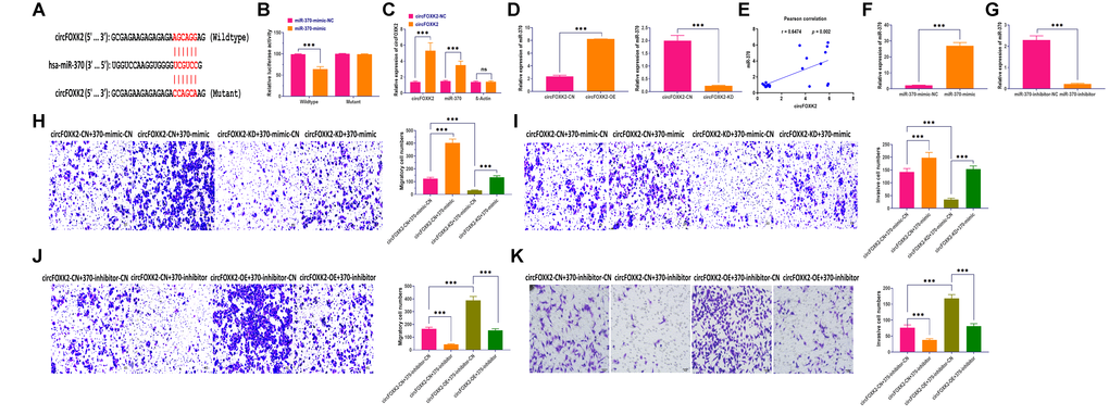 The role of circRNA-miRNAs interaction has been well studied in various cancers [30, 31]. In this study, we used Circular RNA Interactome Database to predict the potential miRNAs interacting with circFOXK2 [32]. The results showed that circFOXK2 had a binding sequence of miR-370 (Figure 5A). Then, luciferase assay revealed that cells transfected with miR-370 mimic plus plasmids carrying wildtype binding sequence showed significantly decreased luciferase activity than those treated with plasmids carrying mutant binding sequence (Figure 5B). Also, circRIP assay demonstrated that miR-370 was enriched in circFOXK2-specific probes compared with those in the control group (Figure 5C). Moreover, the overexpression and knockdown of circFOXK2 increased and decreased the expression of miR-370, respectively (Figure 5D). Also, the expression of circFOXK2 displayed a positive correlation with miR-370 (Figure 5E). Collectively, these results further verified the interaction between circFOXK2 and miR-370. To further determine the role of miR-370 in BC metastasis, we applied miRNA mimic and inhibitor to overexpress and knockdown miR-370, respectively (Figure 5F and 5G). As showed in rescue experiments, the overexpression of miR-370 restored the inhibited migratory and invasive abilities in BT-549 cells with downregulation of circFOXK2, whereas the knockdown of miR-370 exerted opposite roles (Figure 5H–5K). As such, these results indicated that circFOXK2-miR-370 interaction is essential for BC metastasis.