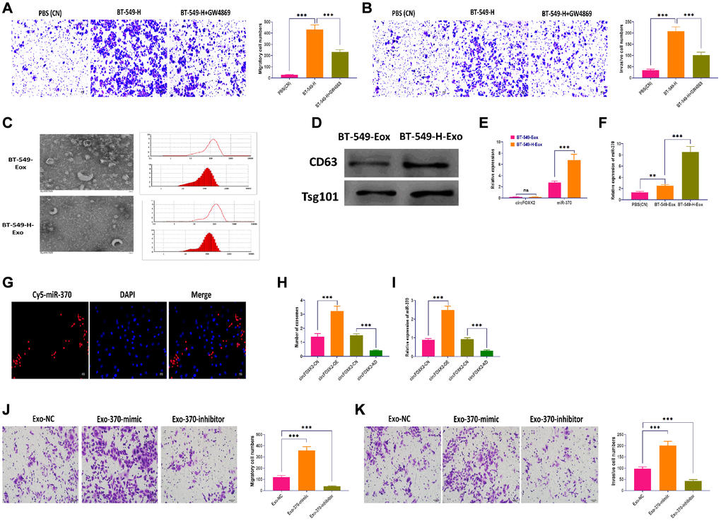 Exosomes play a critical role in intercellular communication in cancers; in particular, cancer cells with high metastatic potential can impact neighboring cells through exosomes [33, 34]. As shown in Figure 6A, BT-549 cells cocultured with BT-549-H displayed significantly increased migratory and invasive abilities, which was reversed the blockade of exosome generation by GW4869 [35] (Figure 6A and 6B). Then, we isolated exosomes from BT-549 (BT-549-Exo) and BT-549-H (BT-549-H-Exo) cells, respectively. The morphology and size of exosomes were identified through transmission electron microscopy, nanoparticle tracking analysis (Figure 6C). Exosomal markers CD63 and Tsg101 were measured by Western blotting assay (Figure 6D). Moreover, we found that circFOXK2 rarely expressed in exosomes, whereas miR-370 was highly expressed in BT-549-H-Exo, compared with BT-549-Exo (Figure 6E). Meanwhile, the level of miR-370 was higher in BT-549-H-Exo than BT-549-Exo (Figure 6F). Fluorescence staining assay demonstrated that exosomal miR-370 derived from BT-549-H-Exo was taken up by recipient BT-549 cells (Figure 6G). Furthermore, the overexpression and knockdown of circFOXK2 could increase and decrease both exosome generation and expression of exosomal miR-370, respectively (Figure 6H and 6I). Intriguingly, exosomes with overexpression of miR-370 promoted migration and invasion abilities in BT-549 cells, while the opposite effect was found in BT-549 cells treated with exosomes with knockdown of miR-370 (Figure 6J and 6K). These results together suggested that circFOXK2 induces metastasis of recipient cells by promoting the transfer of exosomal miR-370.